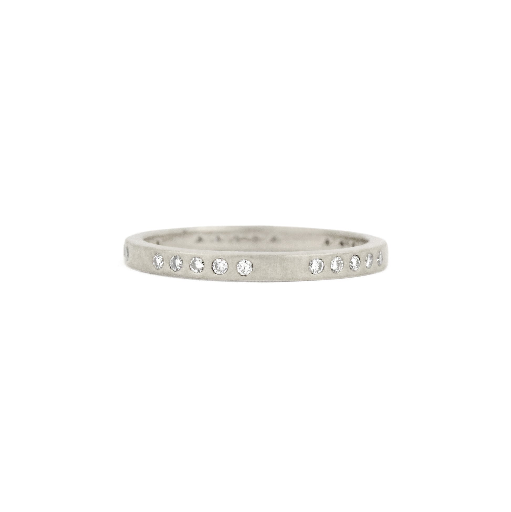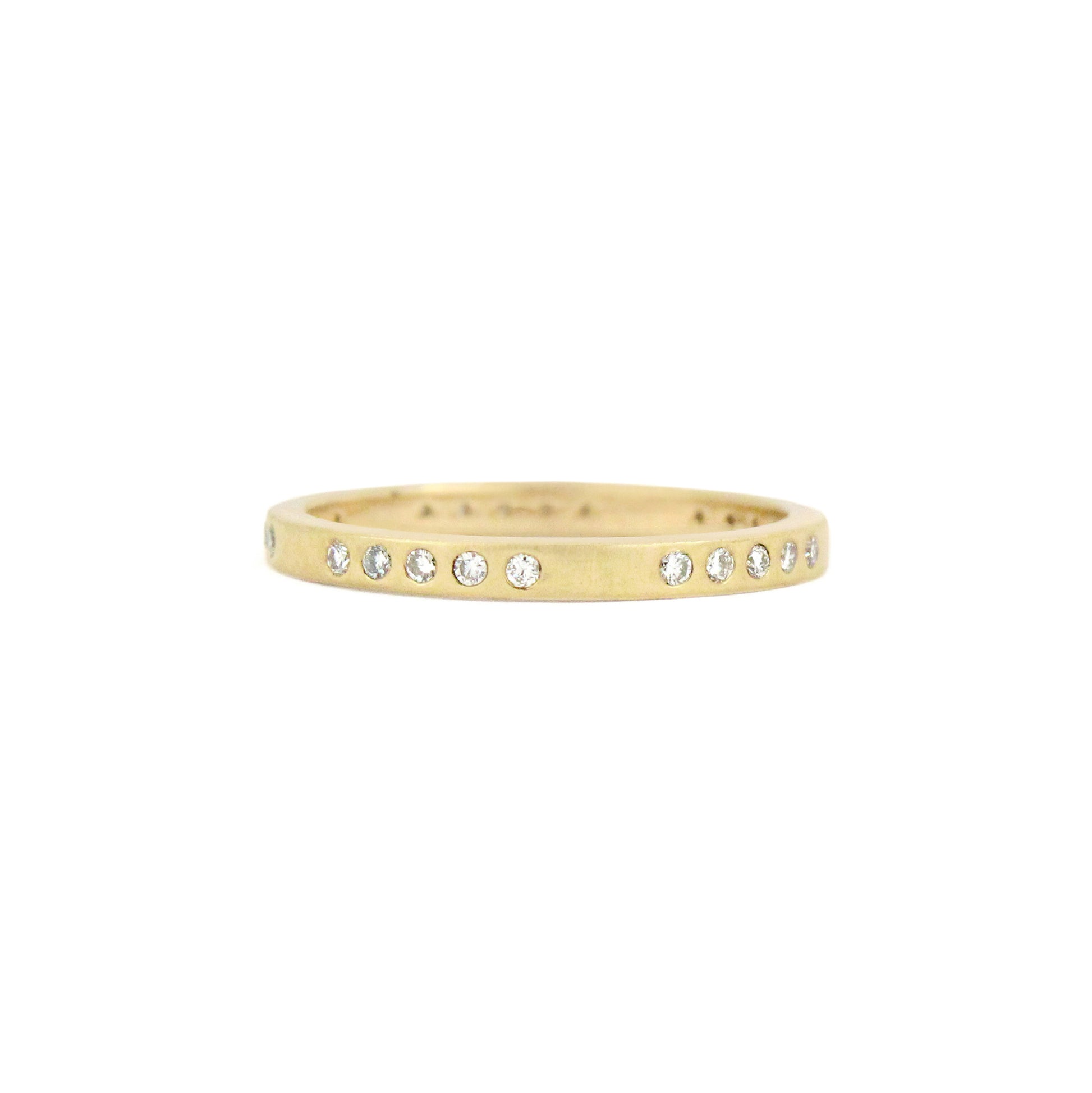 A 14k yellow gold ring set with 25, round white diamonds in a infinity pattern.