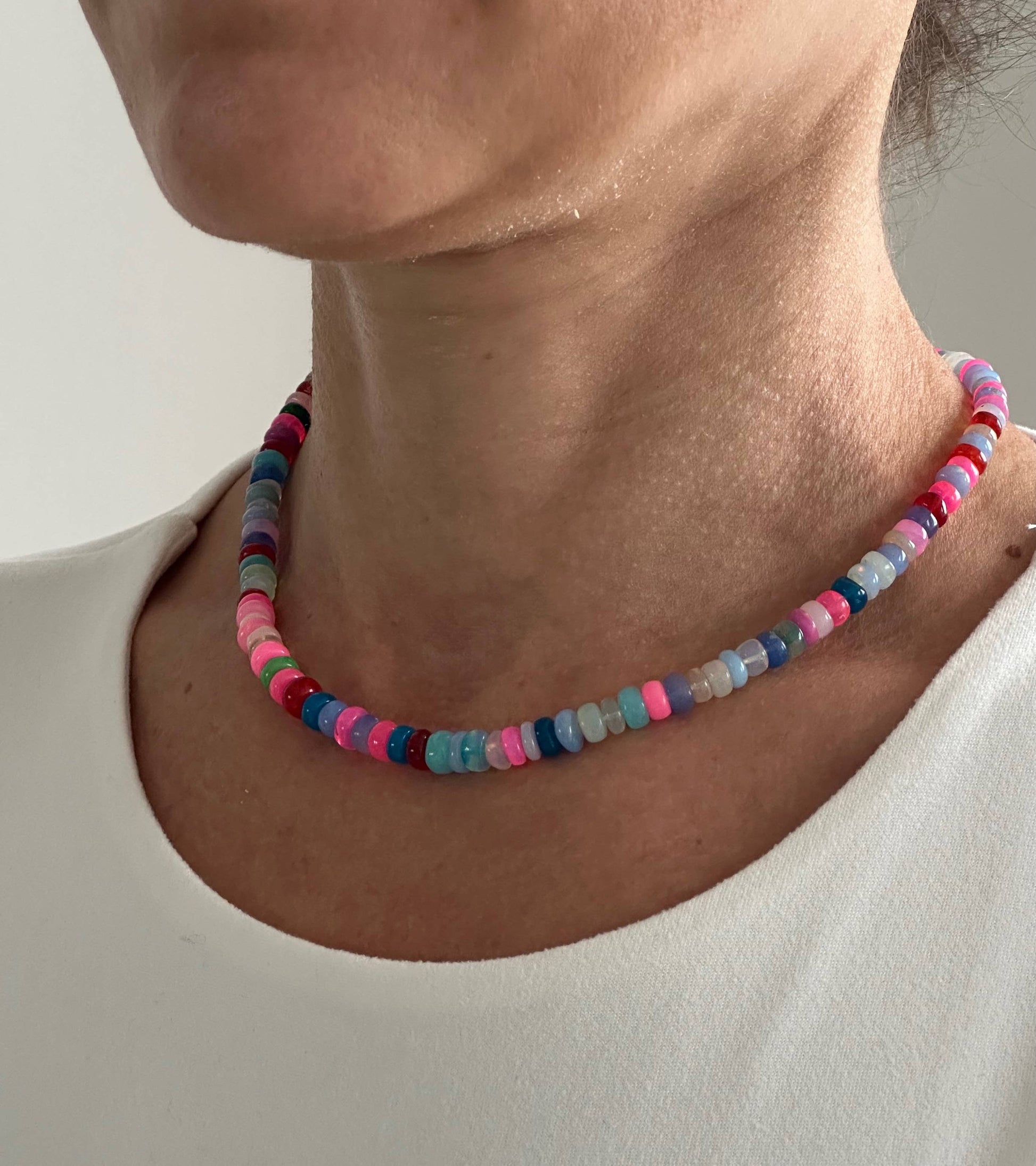 A Summer Staple! Perfect for the office or the beach! High quality Ethiopian Opals are hand-dyed in small batches. This Ethiopian Opal necklace is 16"+2" extender with 18K Gold Plated clasp.