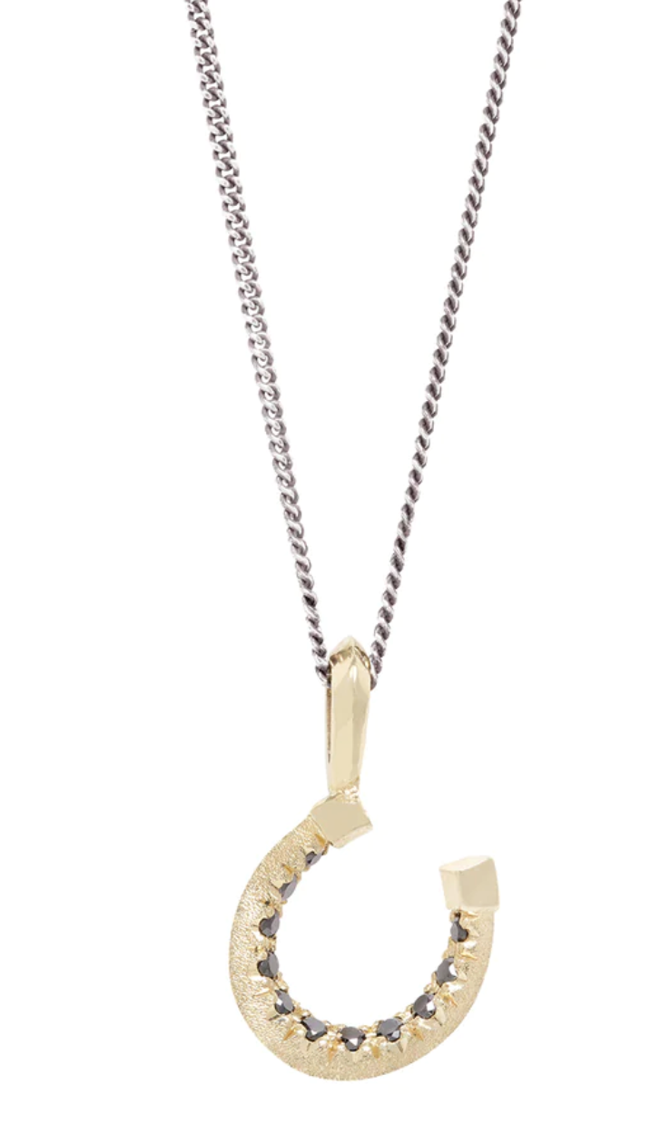 This dainty horseshoe necklace features decorative hand cuts and an inner line of black diamonds set subtly inside its arc. Finished with a holographic stippling for subtle sparkle. Put it on and make your own luck.