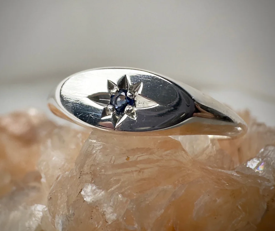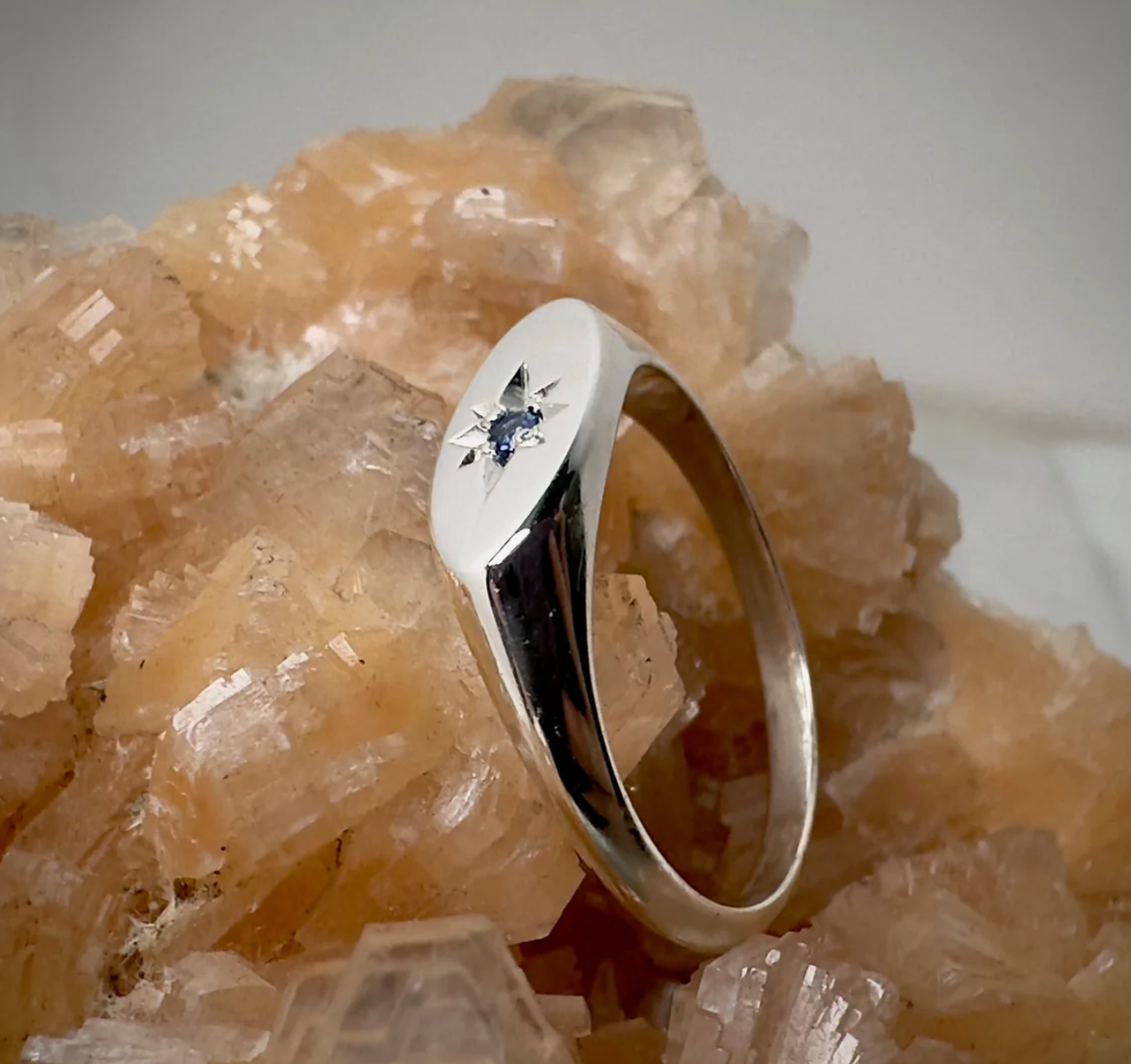 This cute signet ring features a blue sapphire set in the middle of a tiny starburst. This is made of solid sterling silver.