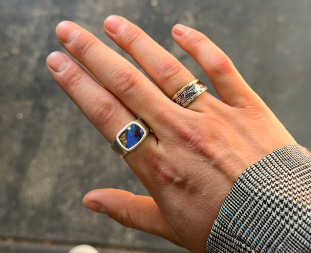 This unisex and versatile ring features a natural 4.89ct Boulder Opal from Queensland, Australia. To protect the stone, we chose to bezel set it in a sleek, minimalist setting that allows the natural beauty of the stone to shine though! The sterling silver has been given a matte-satin finish, which wears really nicely and is much more resilient to every day wearing when compared to highly polished sterling silver.