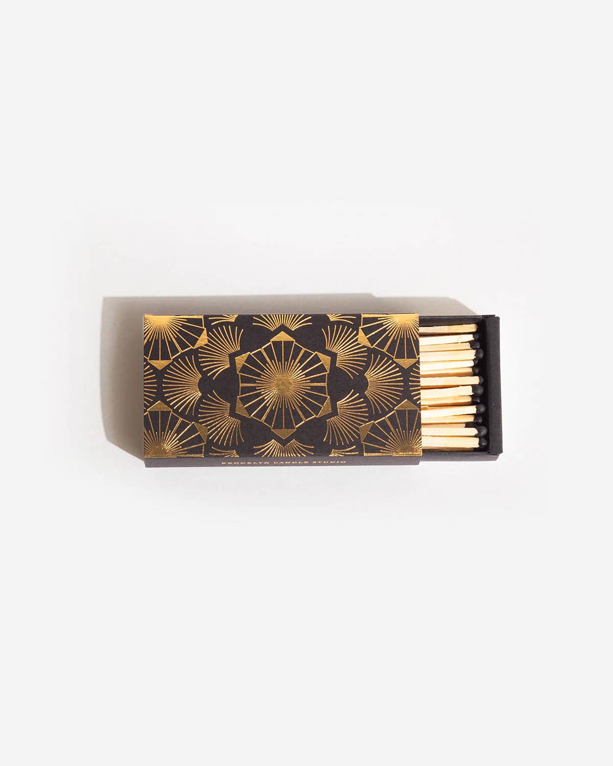 Perfect for celebrating the season. Say it with stylish XL matches featuring art-deco designs foil pressed in gold on chic black matchboxes, perfect for special occasions or just because. Pairs beautifully with a candle and card. Great for lighting the last bits of your candles.