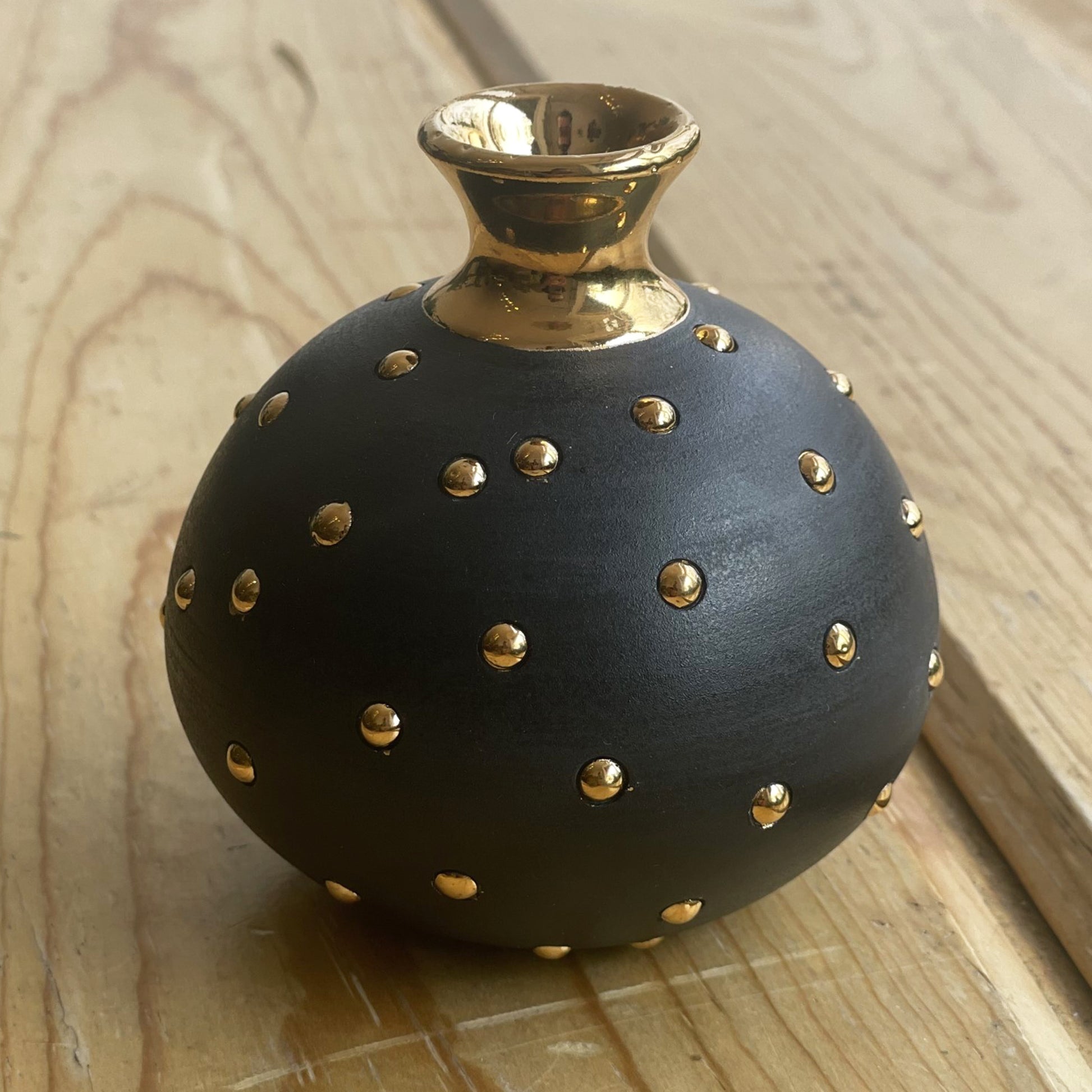 Black bud vase with shiny gold dot detailing and gold opening.