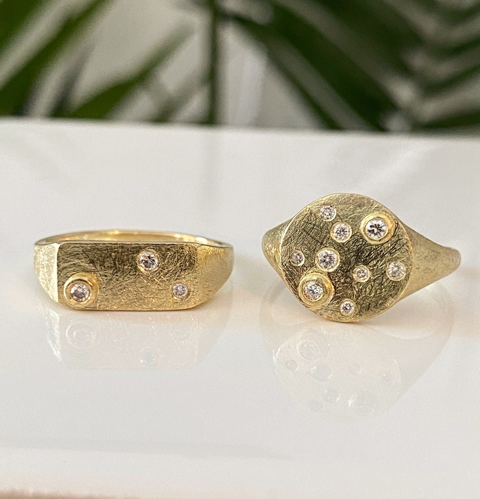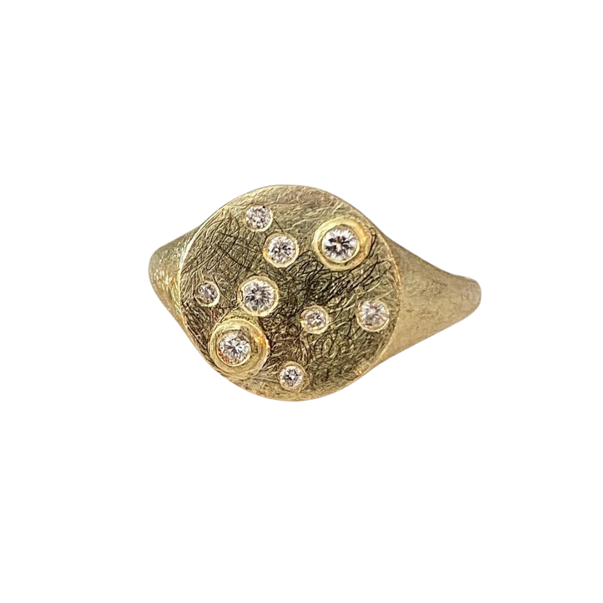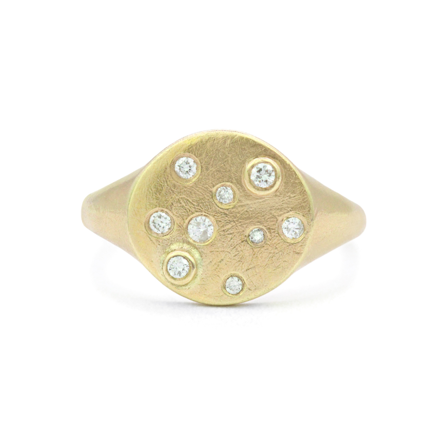 An 14K yellow gold signet ring with a scattering of 0.11ct reclaimed white diamonds.