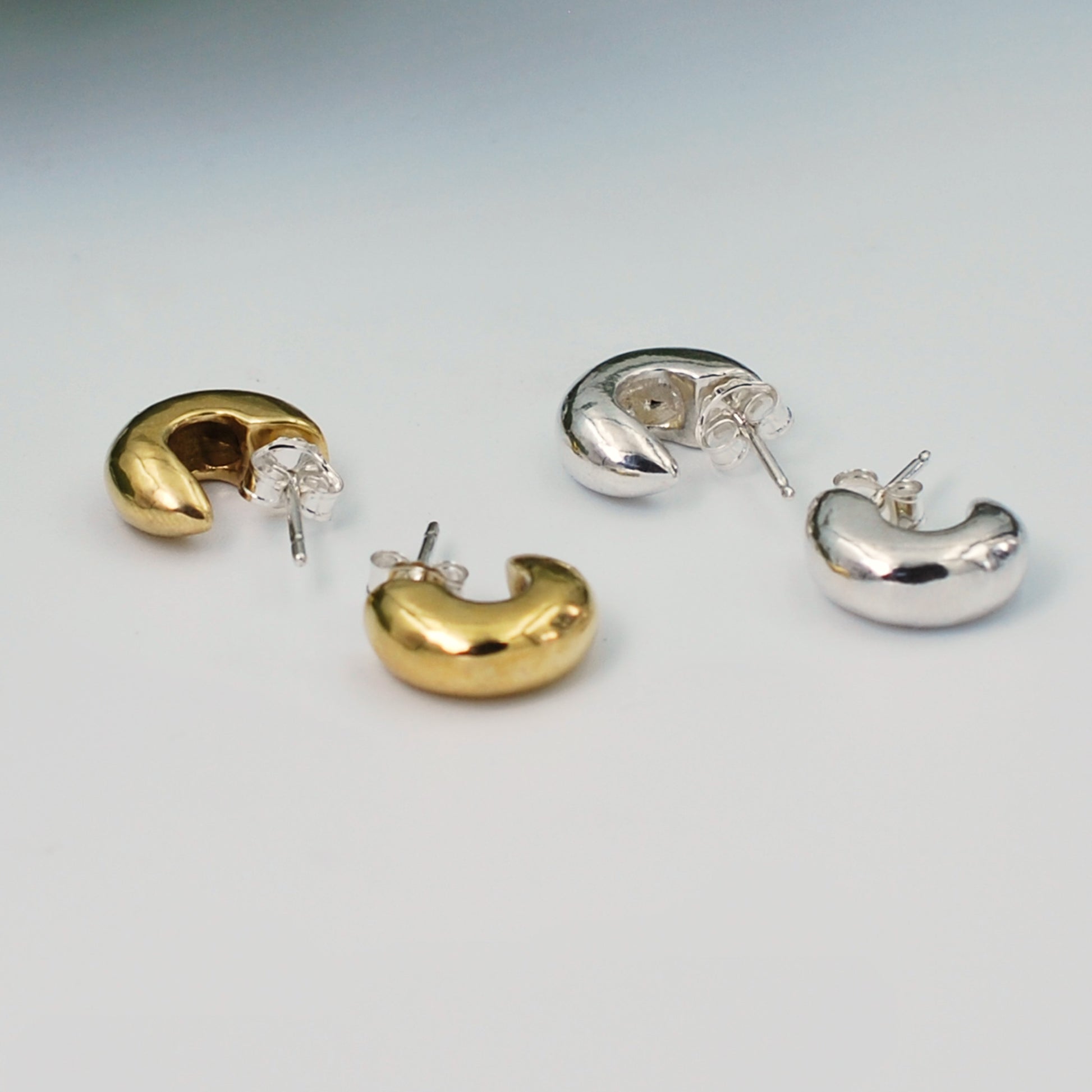 These hand carved studs are cast in recycled brass or sterling silver with sterling silver posts and backs. Weighty little everyday hoops.