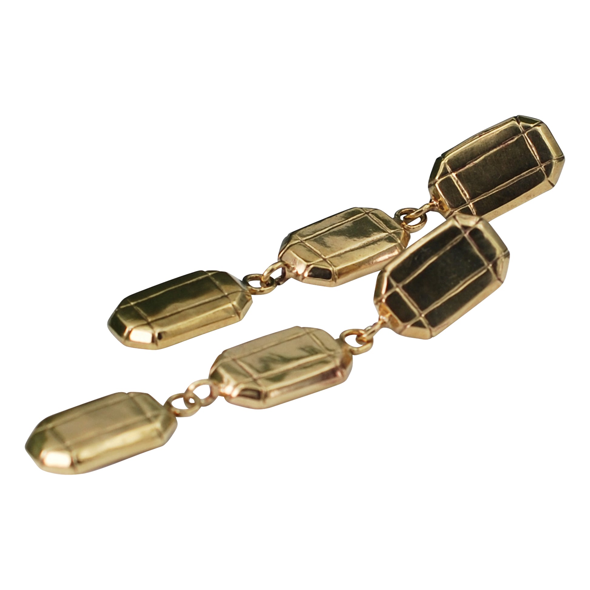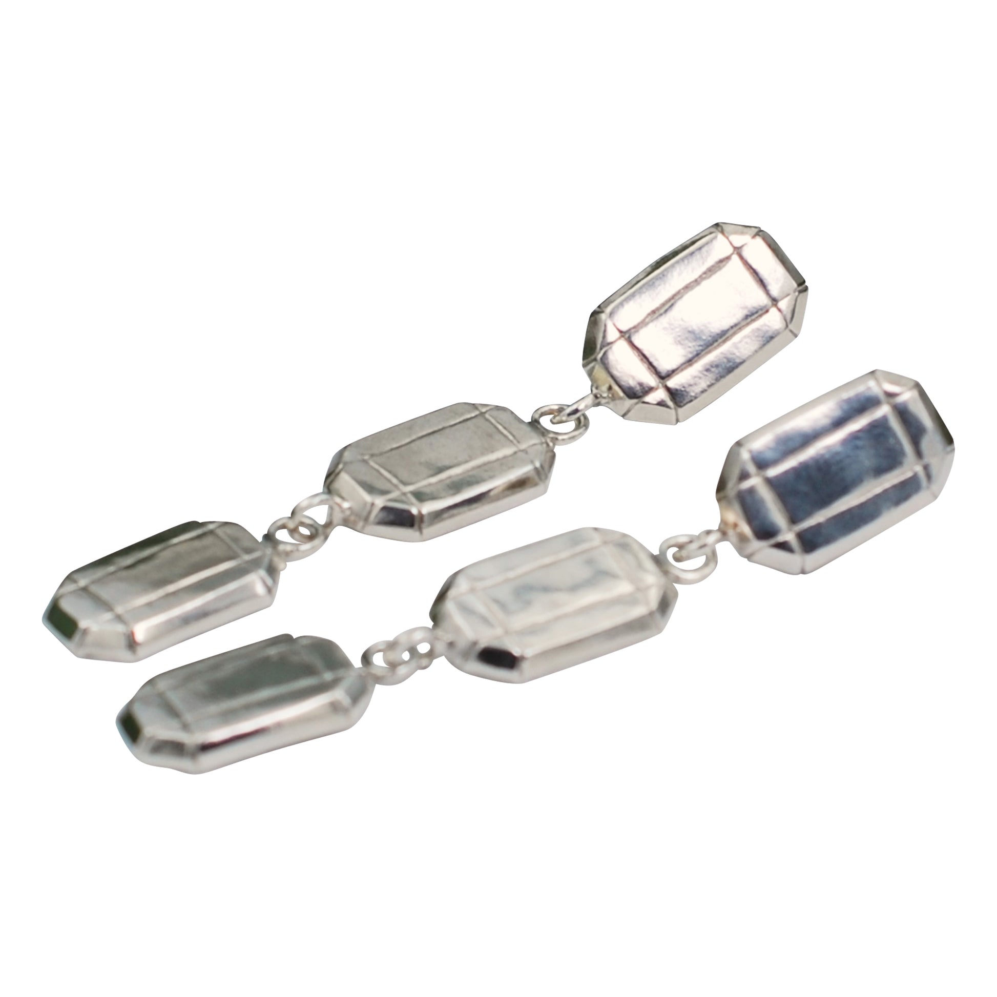 Hand carved “gem stones” in a triple cascade dangle. Amazingly light weight statement pieces. These come in either recycled brass or recycled sterling silver. Both versions have sterling silver post and backs. 3/8” wide by 2 1/2” long.