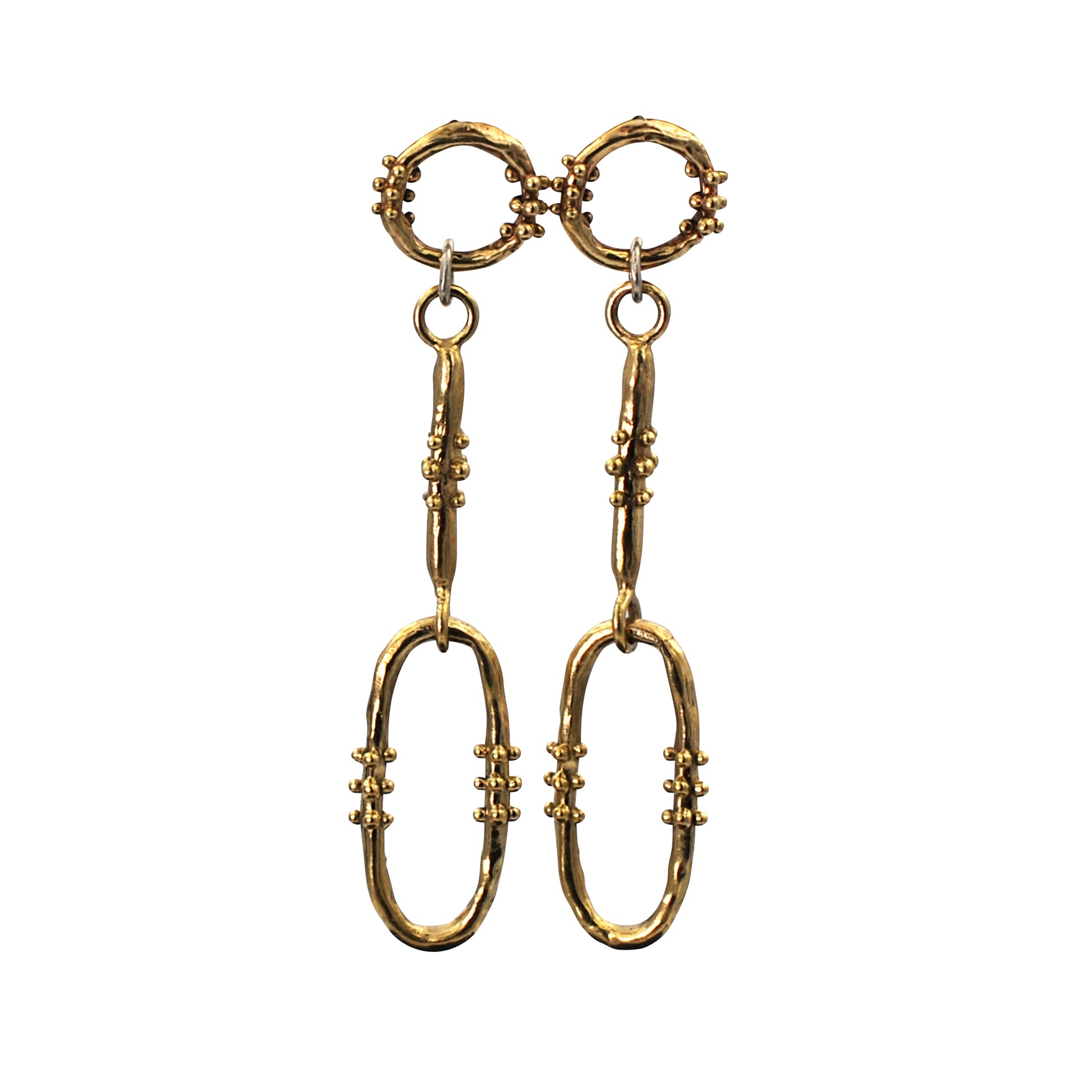 These unique drop earrings are perfectly lightweight. Each charm is cast individually and strung together to make these special earrings. Available in recycled brass with sterling accents for something a little edgy.