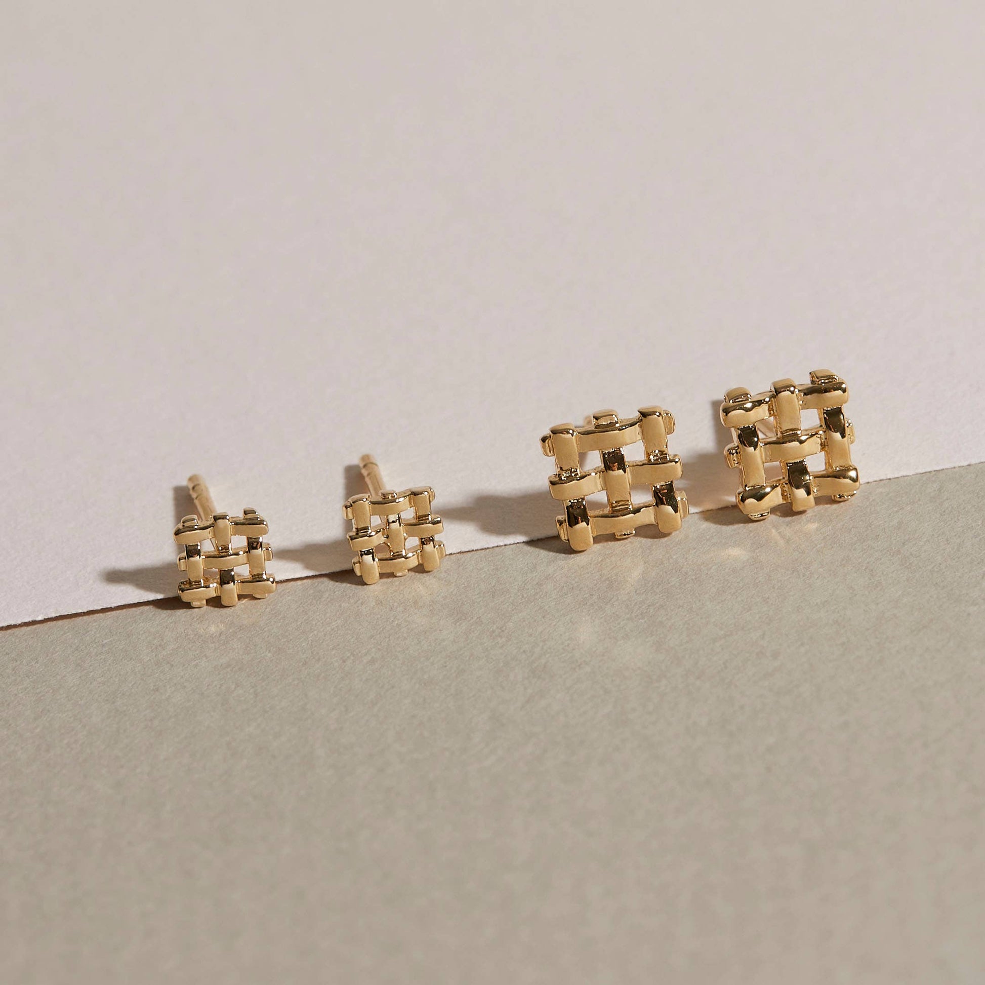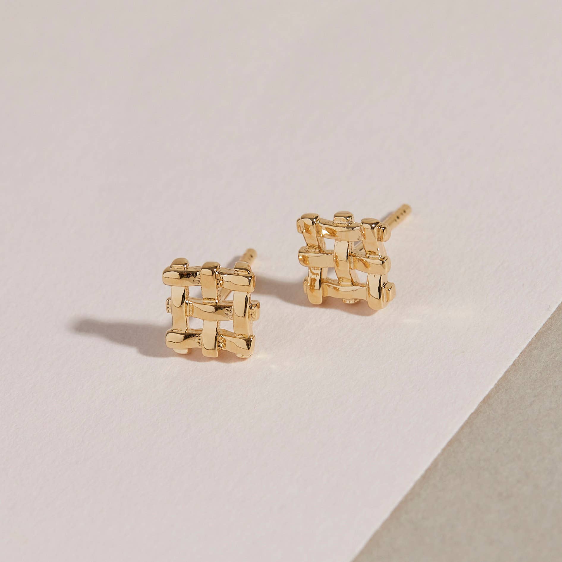 More than just a simple stud. the crosshatch studs feature a perfectly woven square with the smallest detail. model is wearings size small. gold plated brass crosshatch and gold plated sterling earring post sterling posts and backs.