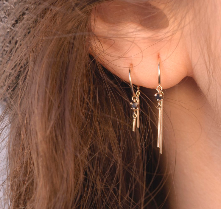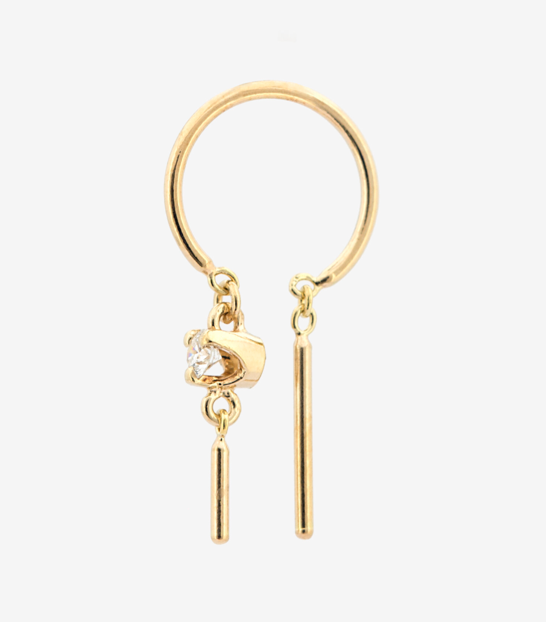 Silent wind chimes that dangle and dance on your ears. These earrings just might be the most noticeable minimalist earrings you’ll ever own. The hoop is slightly smaller and the dangling legs half as long as the the Chime earring. This one adorned with a dangling 2mm prong set white diamond.