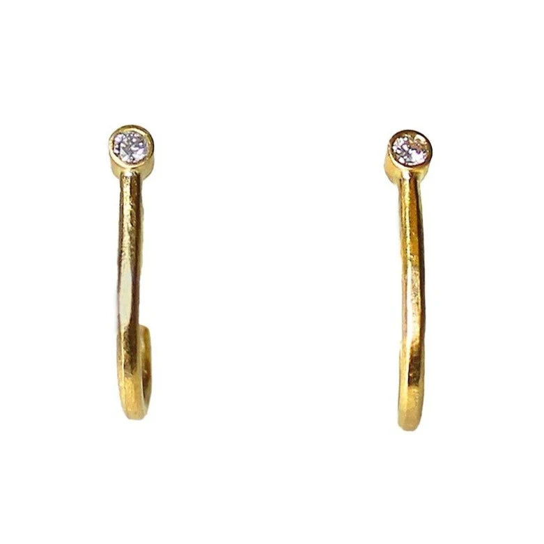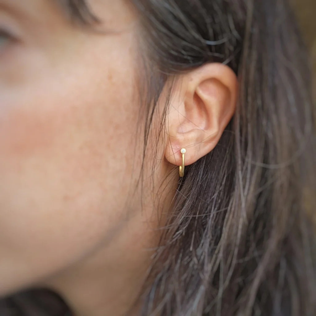 This cute and classic earring will be what you reach for every morning because it just goes with everything! A touch of sparkle from white diamonds accented by bright 18kt yellow gold looping around the ear lobe, makes this huggie act like a hoop but it still has a post a nut backing.