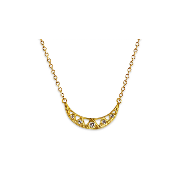 Bold in geometric appeal, yet made at a petite scale for everyday wear. Open pierced triangular shapes hold 5 small diamonds in graduated sizes. Each setting is further accented by hand engraving and mill grain line work for another level of eye catching detail.