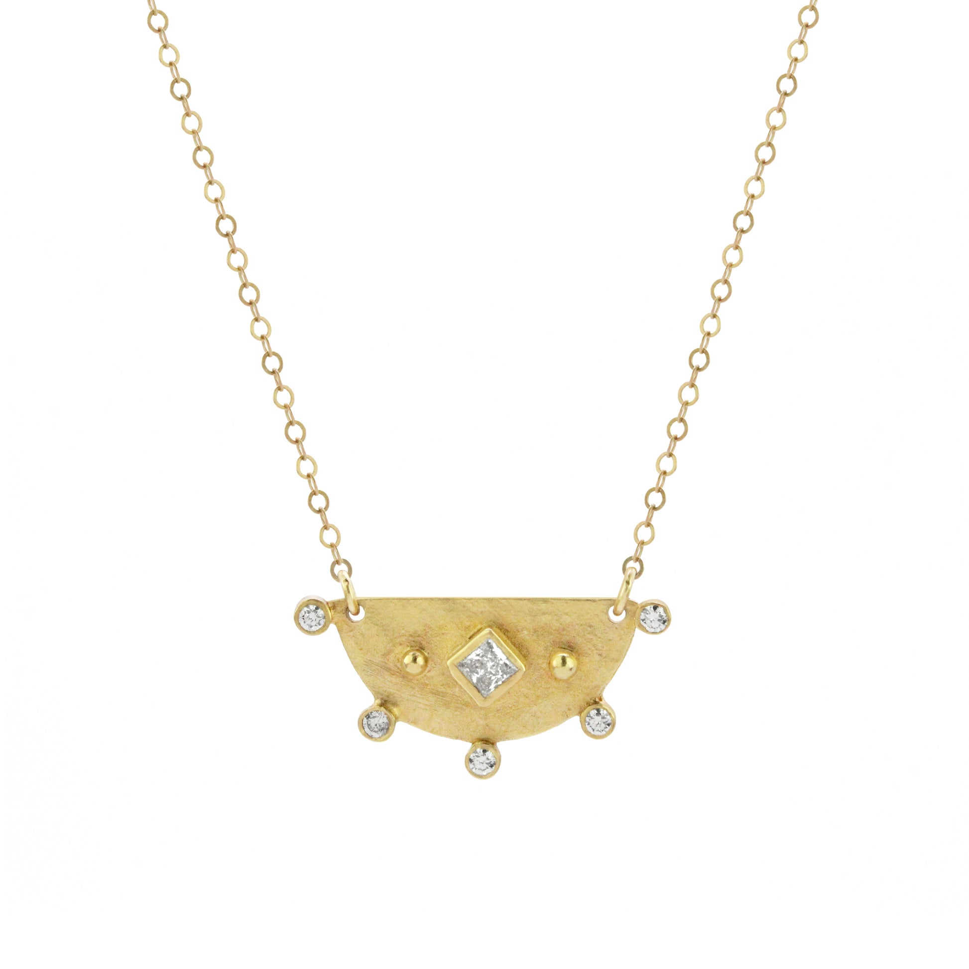 Textured 14k yellow gold half moon with 6 white brilliant lab grown diamonds.