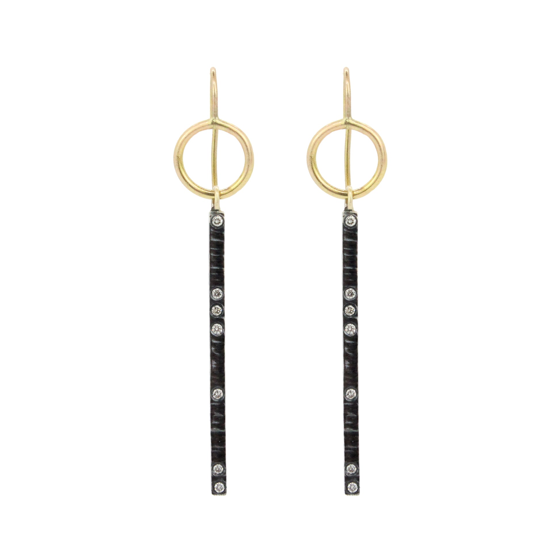 Slender hammered bars of oxidized sterling silver are punctuated by recycled white diamonds (0.168tcw each) as they dangle from an 18K gold circle.
