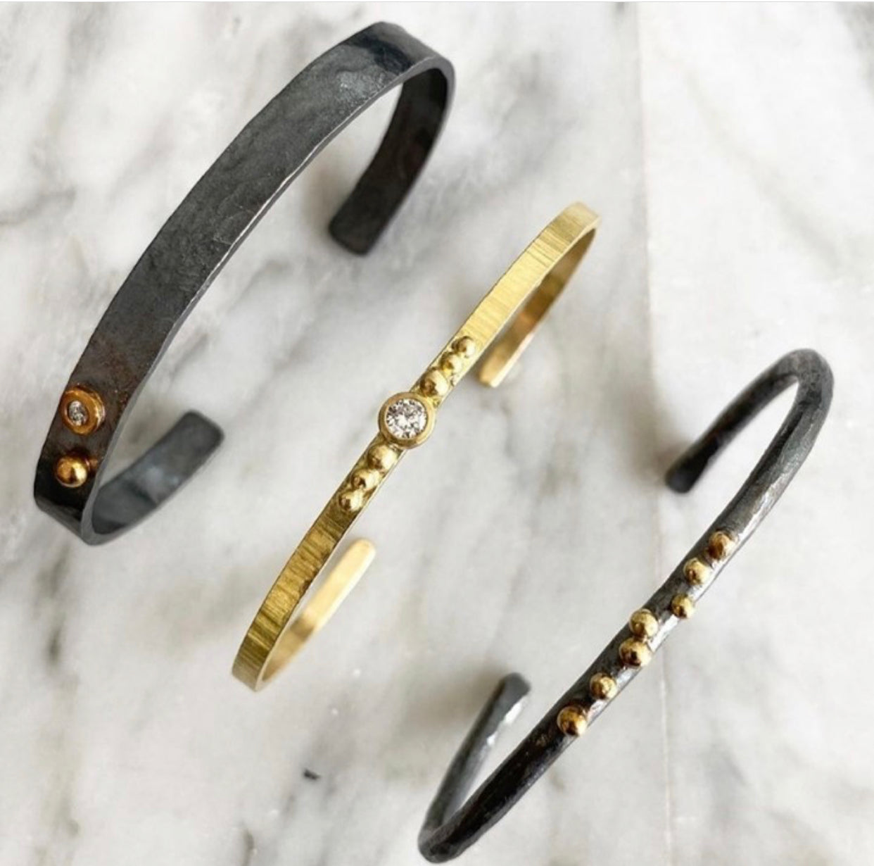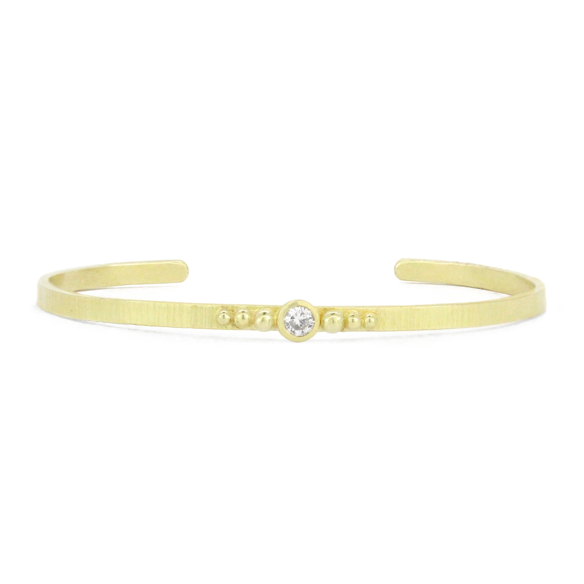 Textured buttery 18k yellow gold cuff with a pop of sparkle. This cuff is 3mm x 1.5mm in dimension and has a 0.08 ct weight white reclaimed diamond.