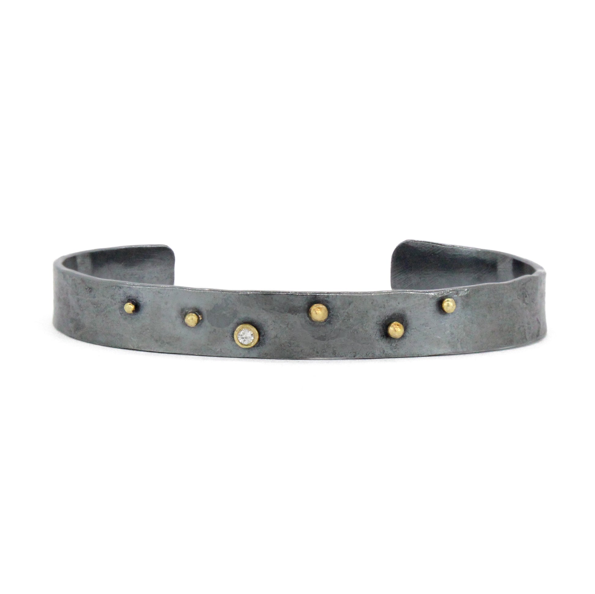 A constellation of 18K gold dots and a recycled white diamond (0.04tcw) twinkled a atop this heavy weight hammered, oxidized silver bracelet.