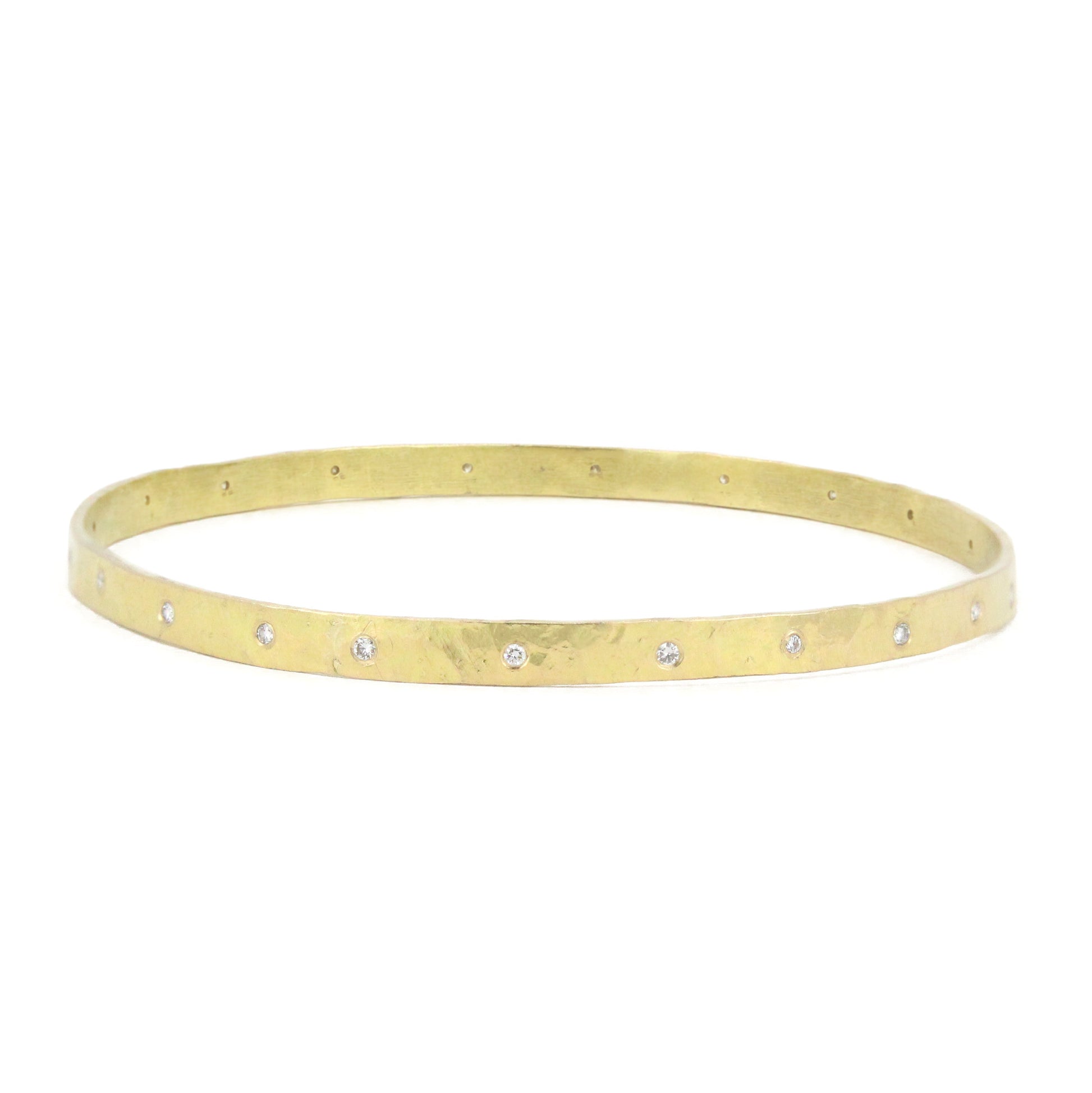 This antique hammered bangle is a stunner! 14k yellow gold has a hammered texture and is adorned with 23 white reclaimed diamonds.