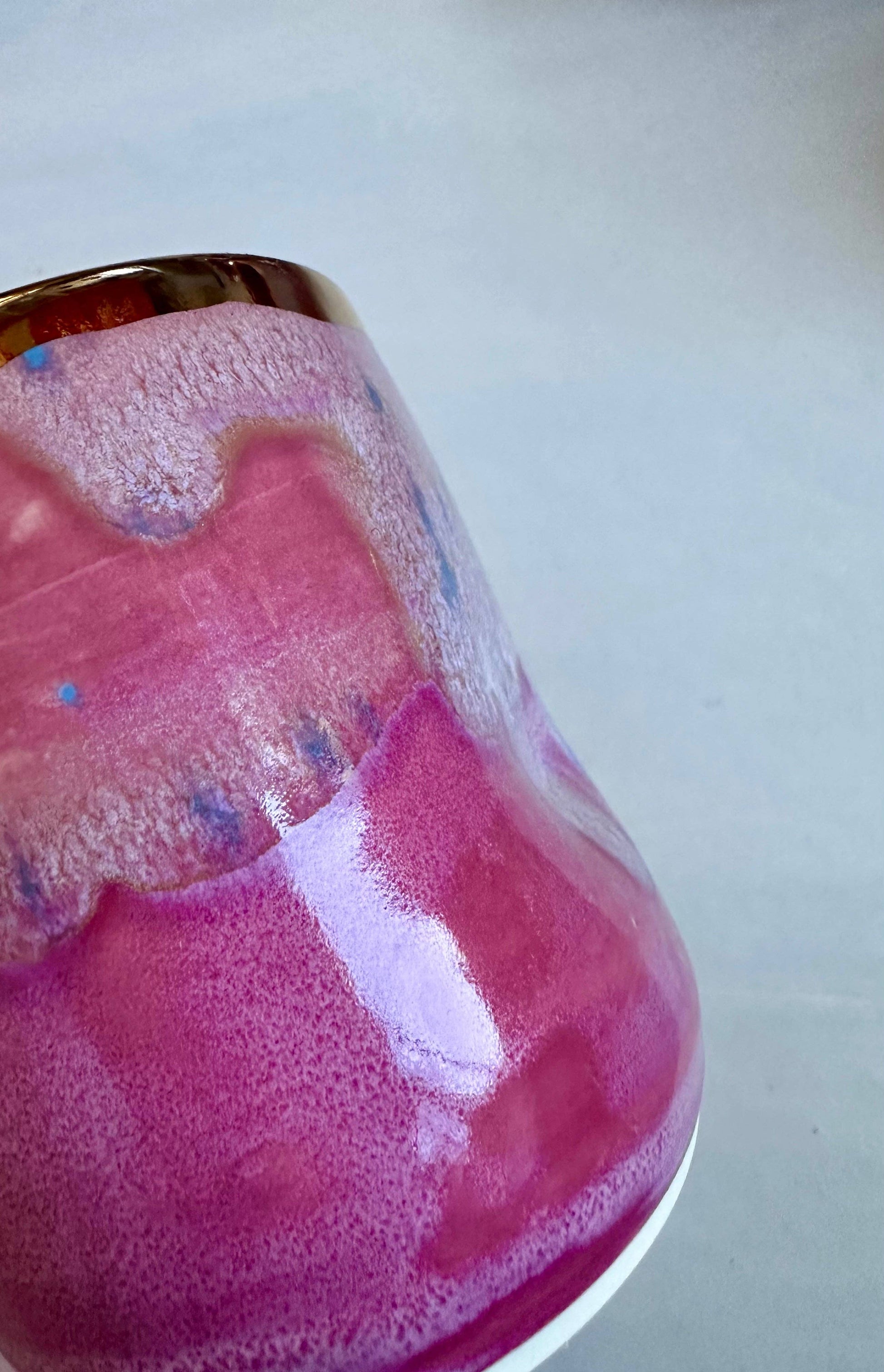 The Smoosh Cup with a 22k gold rim is a handcrafted cup Inspired by the vibrant colors of the Tahoe basin. This unique tumbler features two grip indentations for comfortable holding. Perfect for cocktails, coffee, or as a stylish planter.