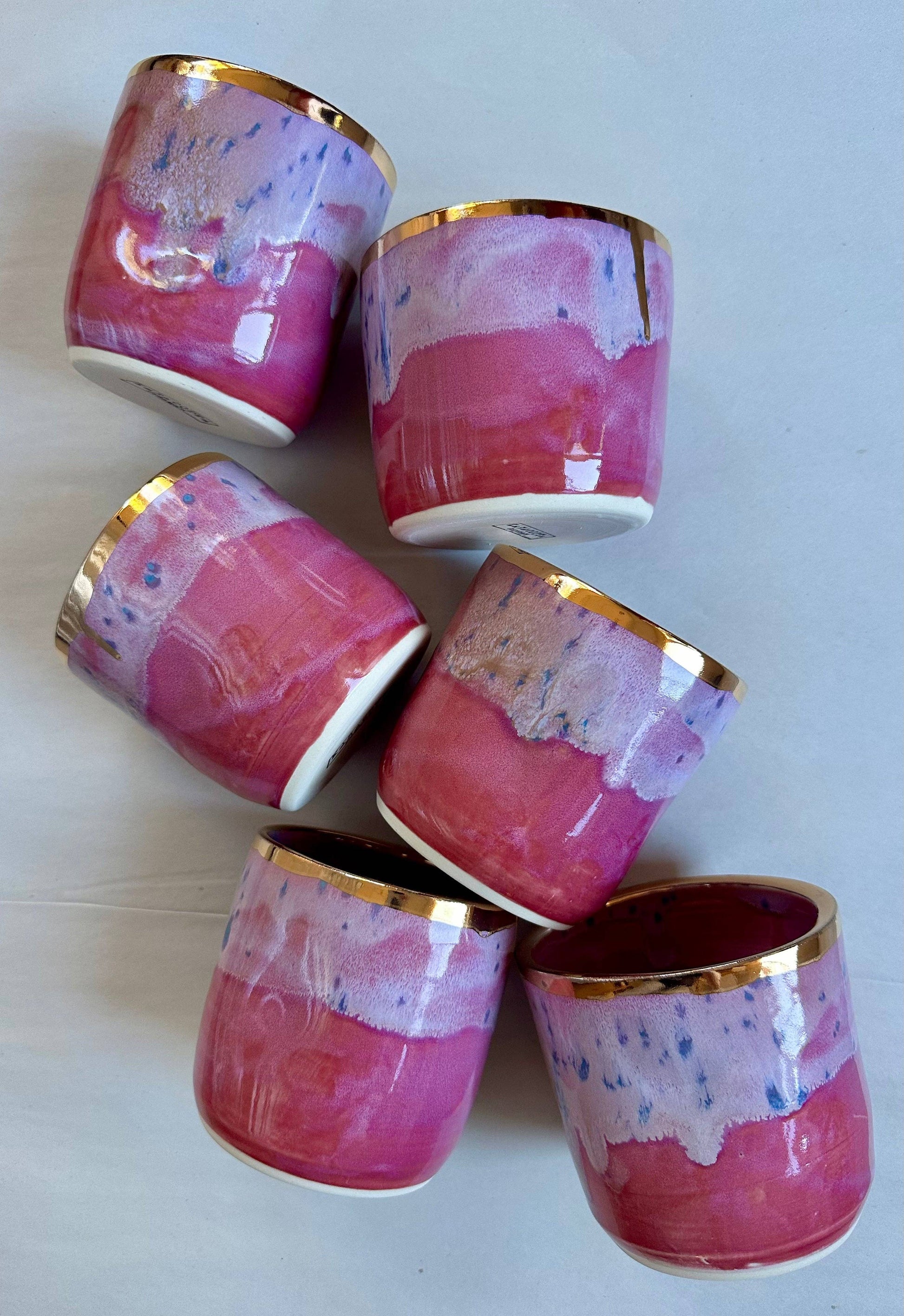 Features: - Holds 8-10 oz. - Made from porcelain claybody - Hand-glazed with custom glazes - 22k gold rim (food safe) - Made in the USA - Gentle hand-washing recommended - Avoid temperature shock - Handmade; appearance may vary