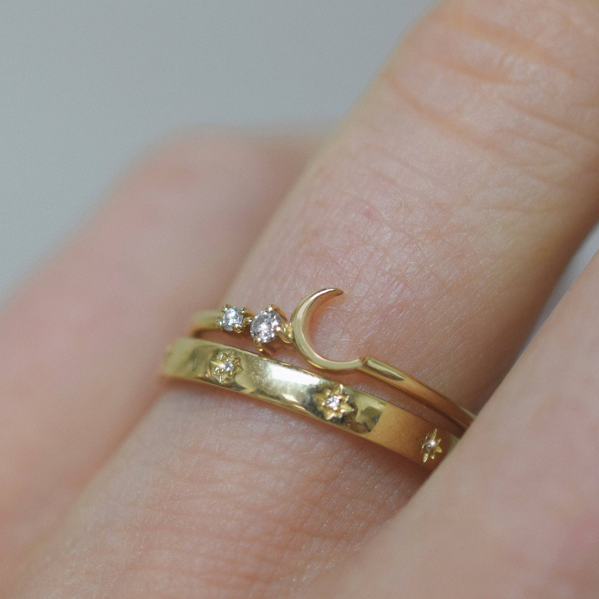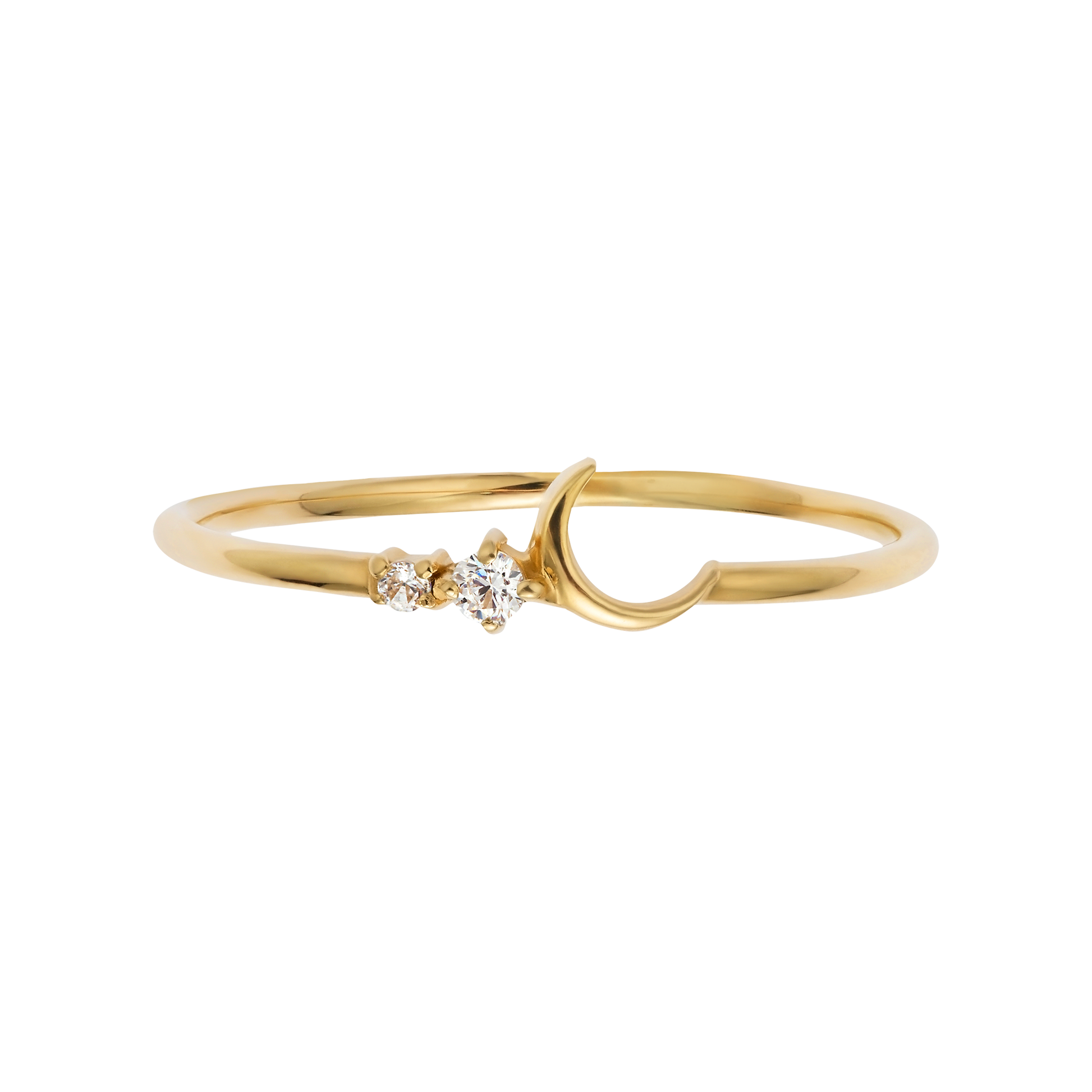 A whimsical crescent moon ring with two delicate diamonds creates this asymmetrical stunner. It's unique yet minimal design make it perfect for stacking or wearing as a stand-alone piece.