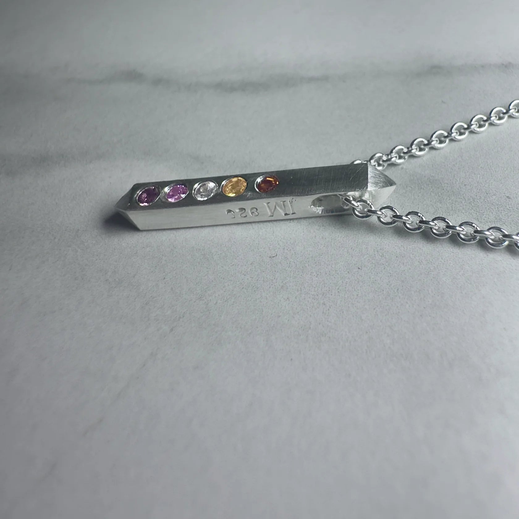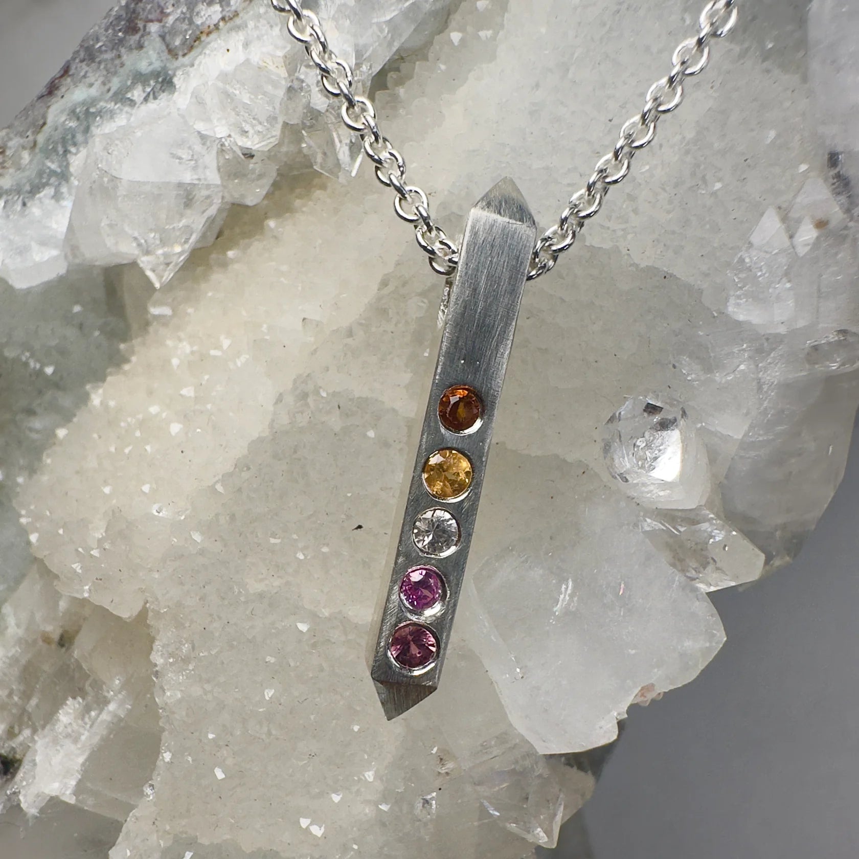 This pendant Features five flush-set gemstones, which correspond to a stripe in the Lesbian pride flag. The stones in this pendant are a dark orange Madeira Citrine, 'Mandarin' Spessartine Garnet, white sapphire, pink sapphire and a 'Berry' red sapphire.