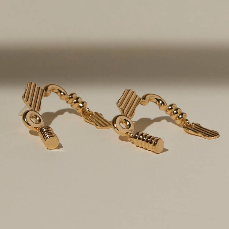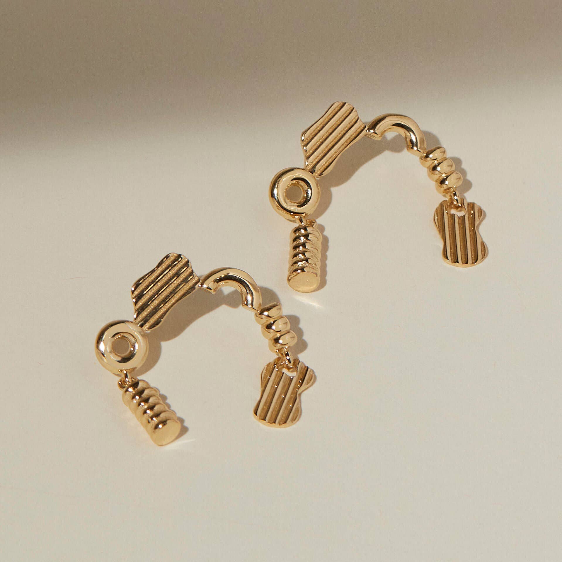 Not your average earrings, the lia earrings feature an arc of modern shapes with two movable charms that shimmy with every motion.