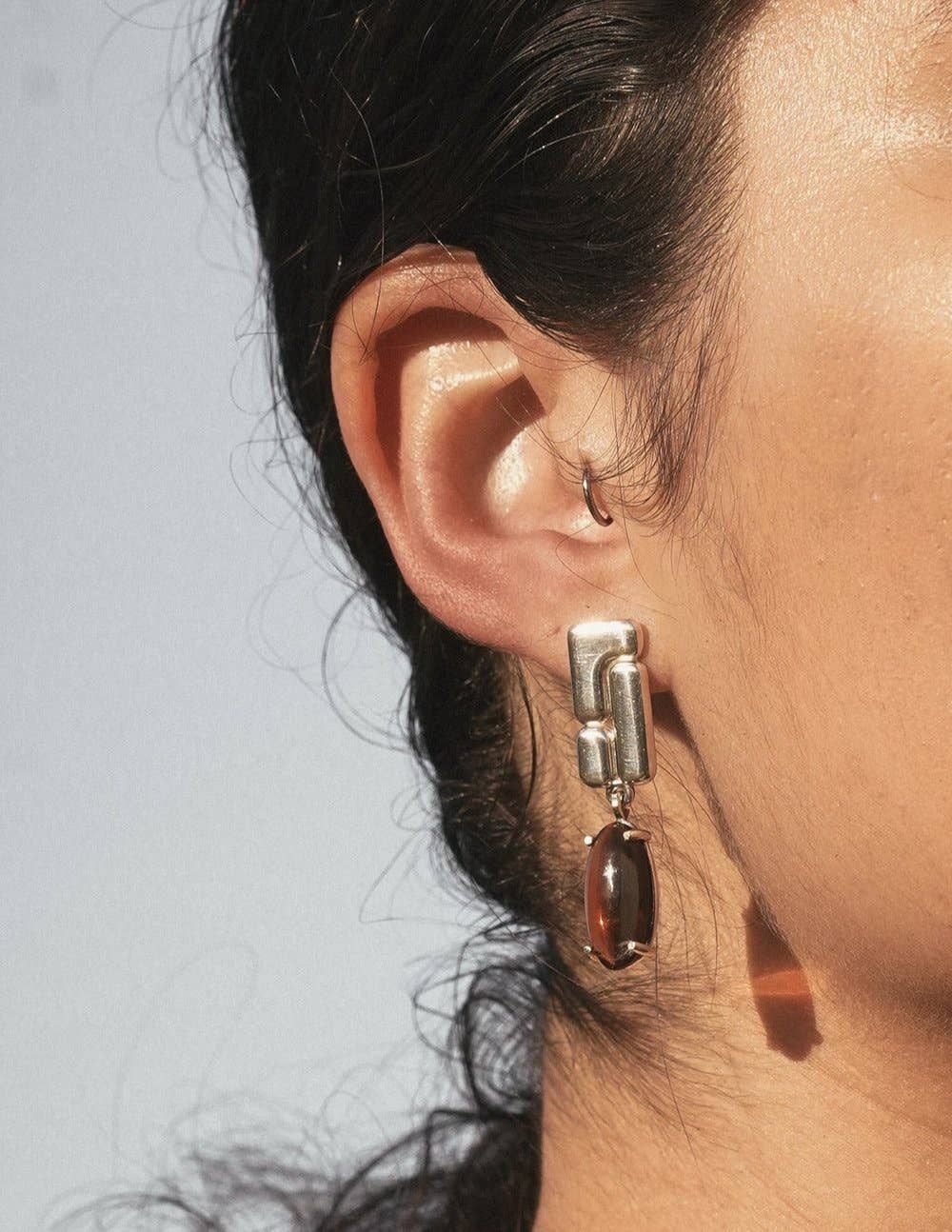 This design started as midcentury inspired shapes but took on a little bit of playful Tetris vibes. Soft angles in metal complement the curves in the elongated oval Czech glass.