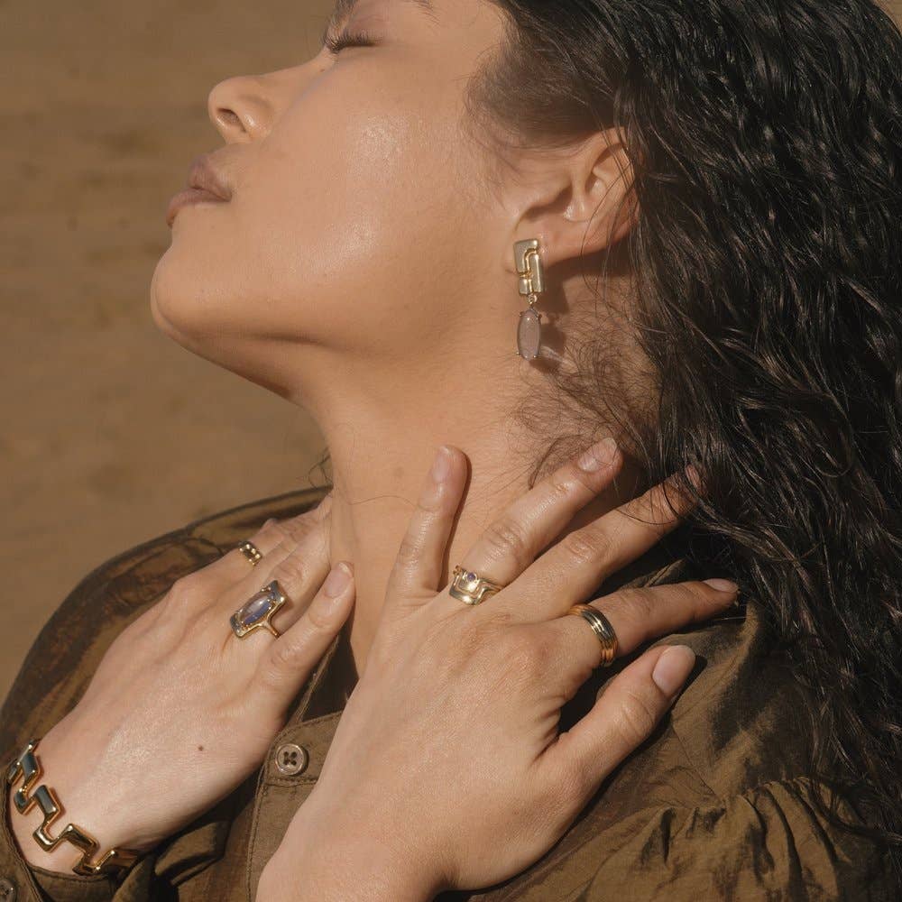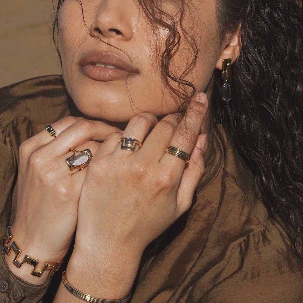 Soft angles and negative space come together for one ring that gives the illusion of two. cobalt blue Czech glass cabochon gold plated brass.