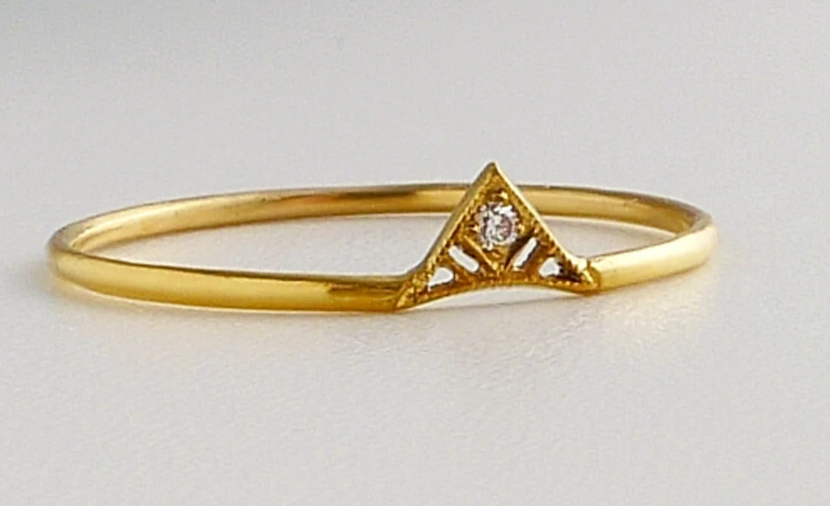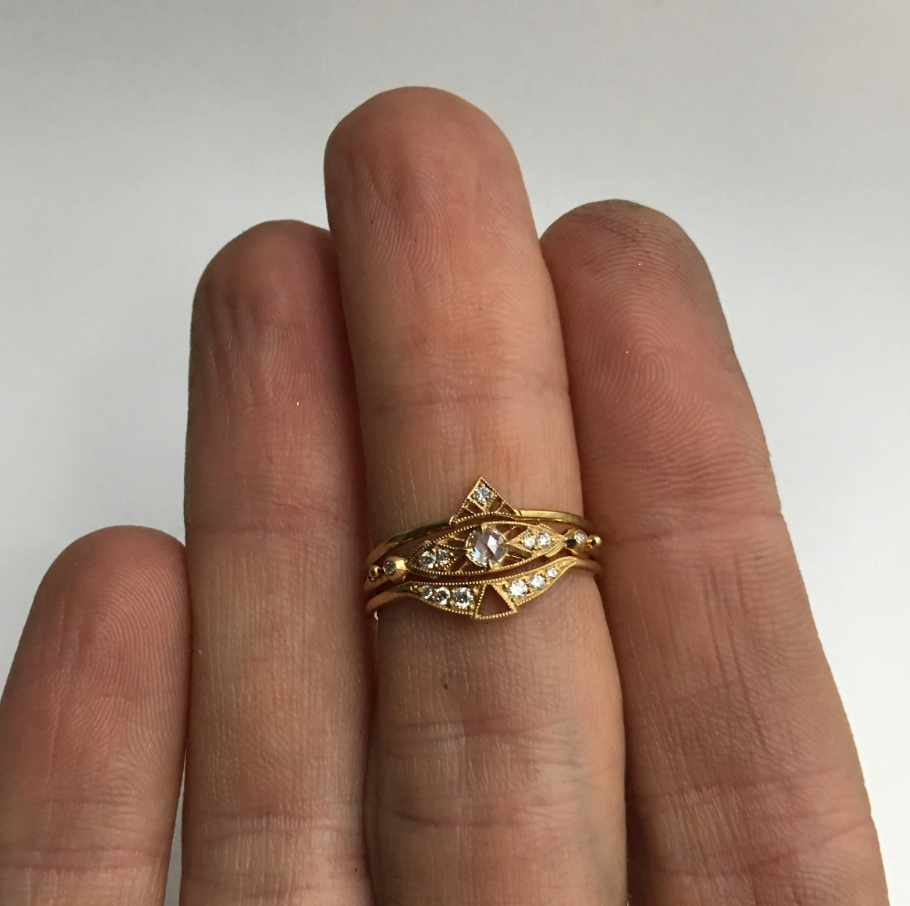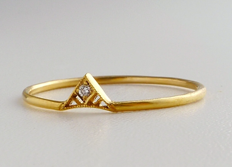 A demure diamond pointer with a slight curved base to help find close company with a small solitaire or accent a straight band if needed. With no other rings around, she is happy to stand out in sweet solitude.