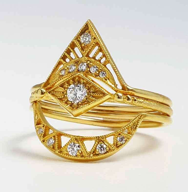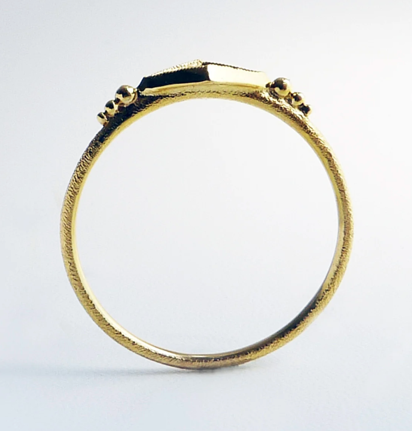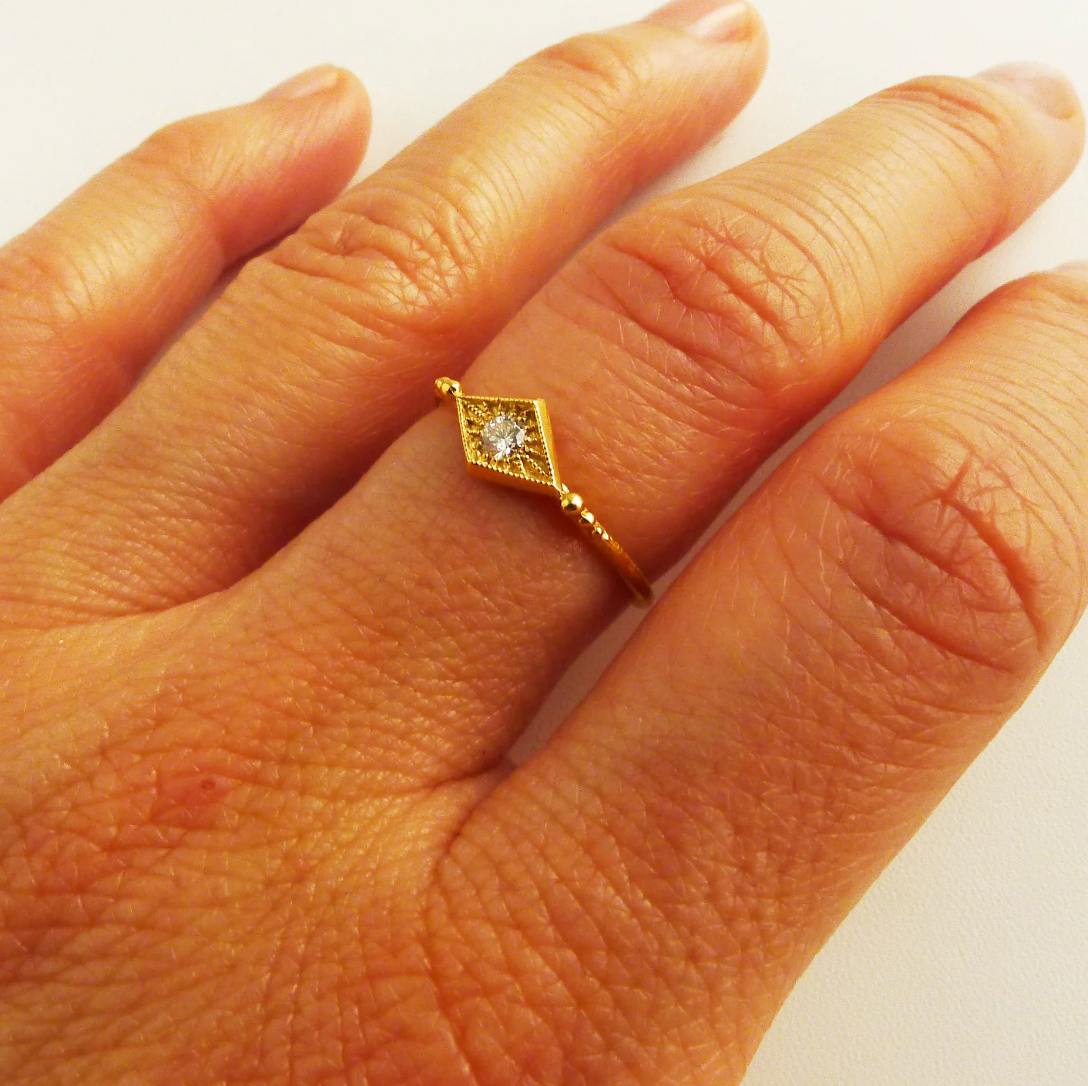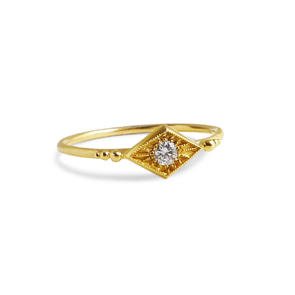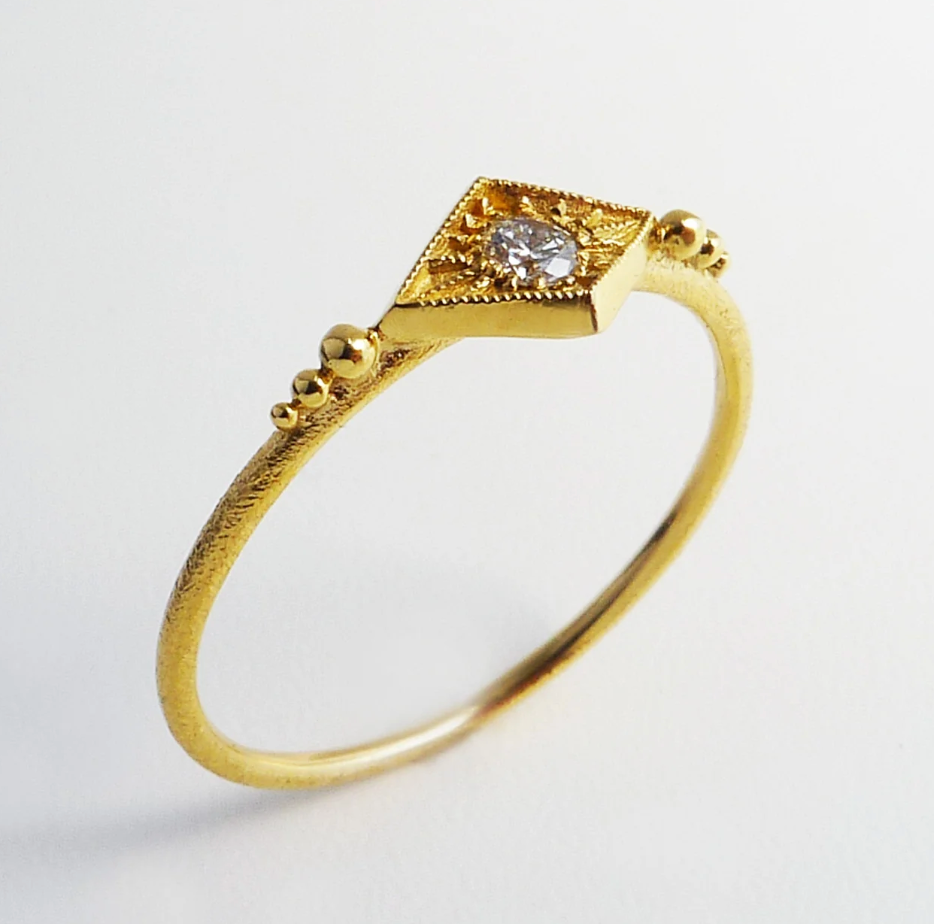 A simple solitaire that can hang by itself or with a posse of others. The diamond shape setting is flanked by 6 gold granules descending into a hammered textured band. The setting is lifted to sit flush with other delicate bands.
