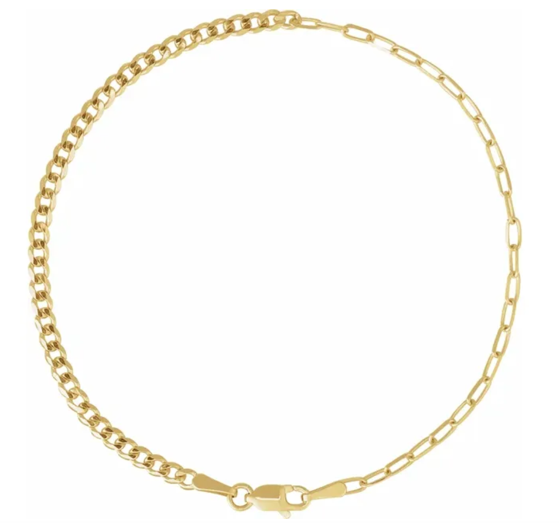 14k chain bracelet created with a mix of paperclip and curb chains. This is a fun and fashionable style that is suitable alone or worn with your stack.
