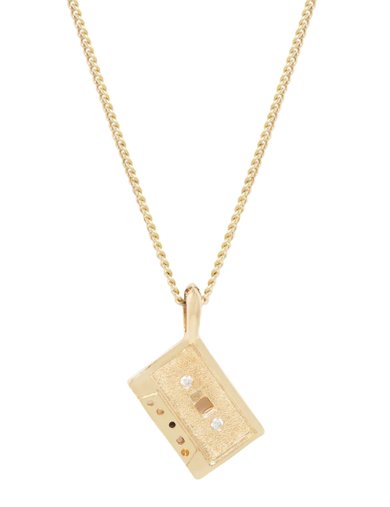 A tiny bit of musical nostalgia to adorn you, or a perfect gift for anyone with music as their love language - this tiny cassette tape in solid 14k gold features two flush set diamonds and holographic stippling. Available with or without a chain.