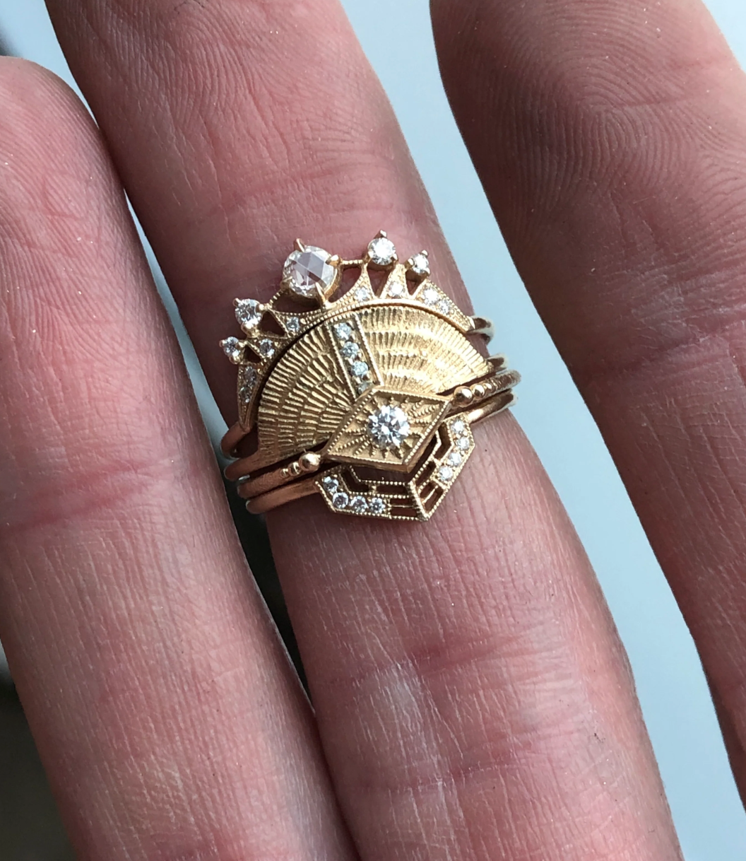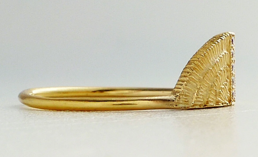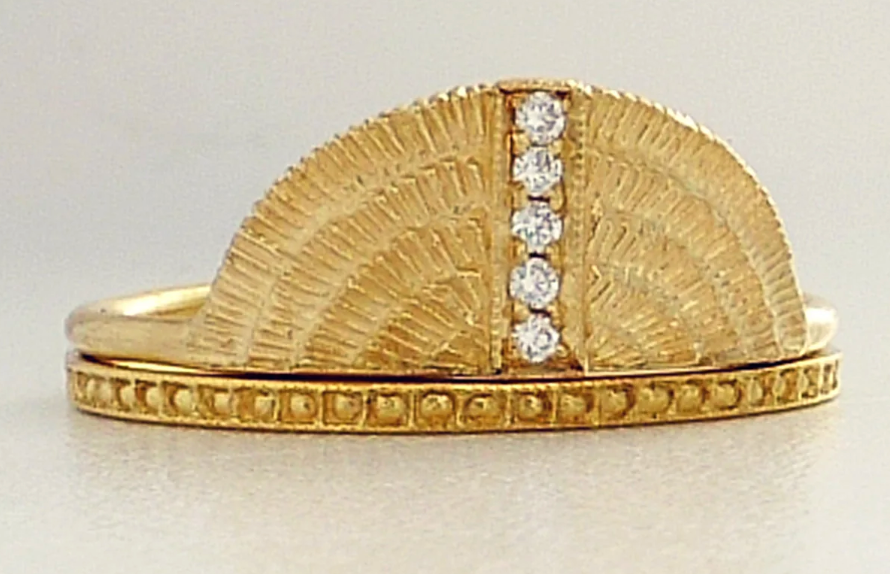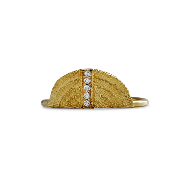 Like a sunrise from an ancient hieroglyph, this ring is styled with a touch of Egyptian revival. Eye catching relief carved rays are parted by a small river of bead set diamonds.