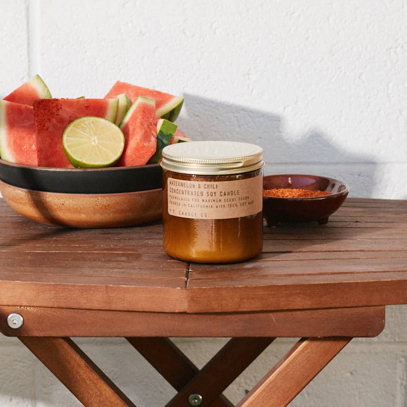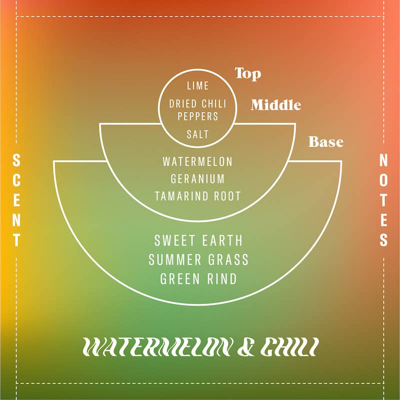 Scents meant to welcome in longer days and warmer nights, with scent notes inspired by some of our favorite memories of summer in California. Watermelon & Chili is fruity and spicy, like park picnics and chili covered fruit