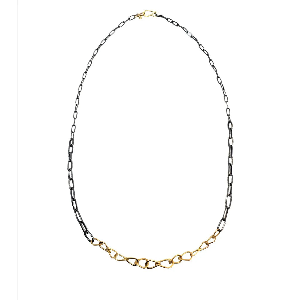 This chain is made up of handmade links of sterling silver chain and 18kt tear drop shaped center links. The sterling is oxidized for a strong contrast. This chain is fantastic for layering with different lengths!