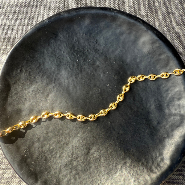 This chain is expertly crafted in 14K gold with a lightweight, hollow core. Due to its delicate nature, please handle with care—dented links may not be repairable. To preserve its beauty and integrity, we recommend storing it properly and removing it during physical activity or situations where it could be exposed to impact or stress.