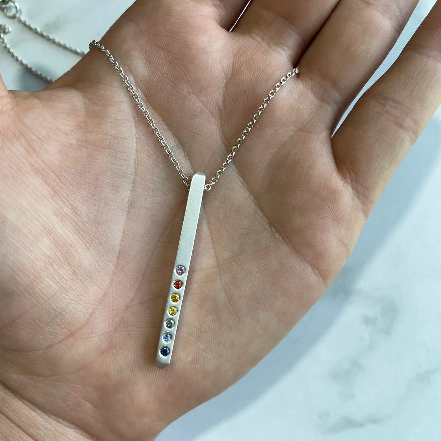 This pendant features nine diamond-cut natural Sapphires, which were flush set into a thick silver bar. Together, the differently colored sapphires create a rainbow ombré gradient! This pendant comes standard with a matte finish on an 18" cable chain with a lobster clasp.