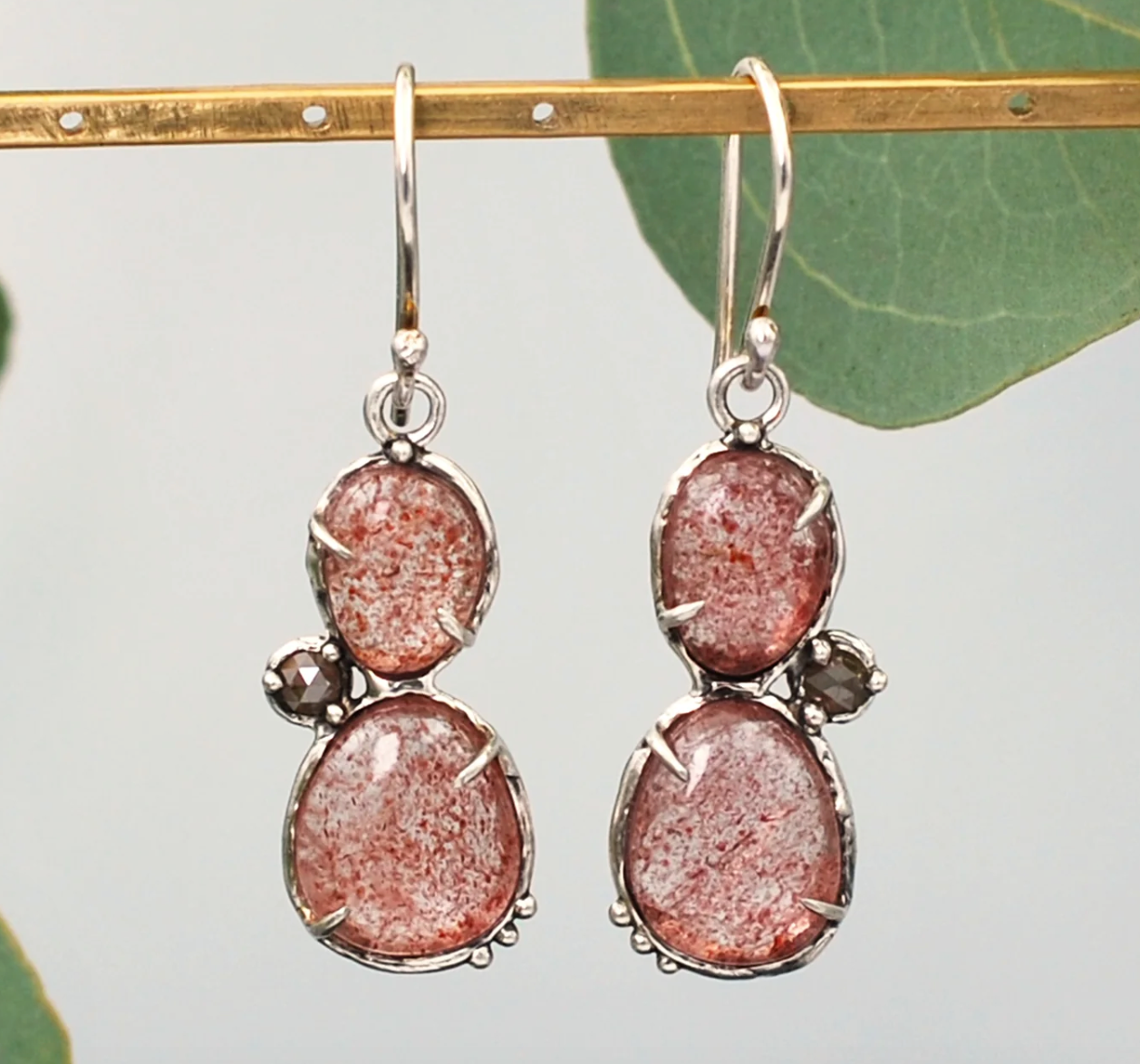 Organic one of a kind sterling silver drops showcasing four strawberry quartz cabachons and two rustic rose cut diamonds weighing 1/3ct. Approximately 1.75" in length and .5" wide. Handmade sterling silver ear wires.