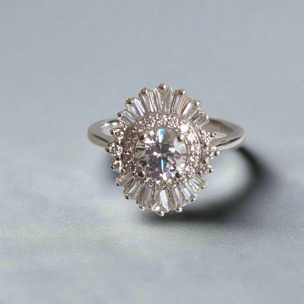 A 14k gold ring with a 1ct center round diamond surrounded by a 1/2 ctw of baguette and round diamond halo.