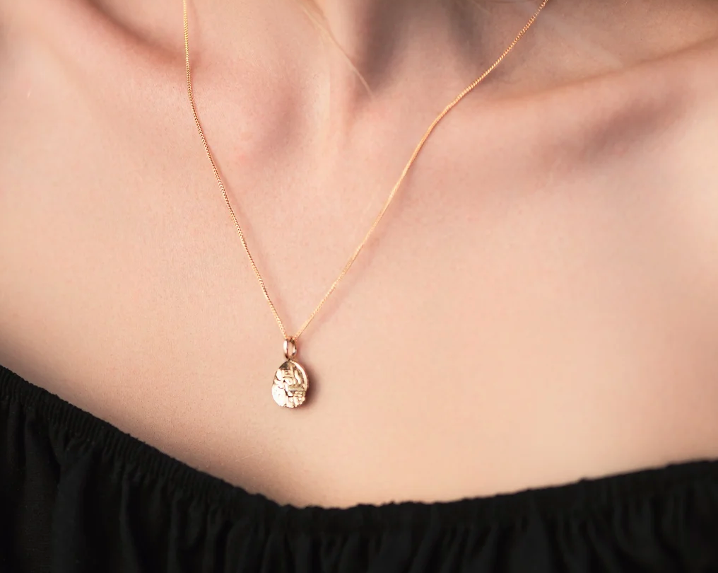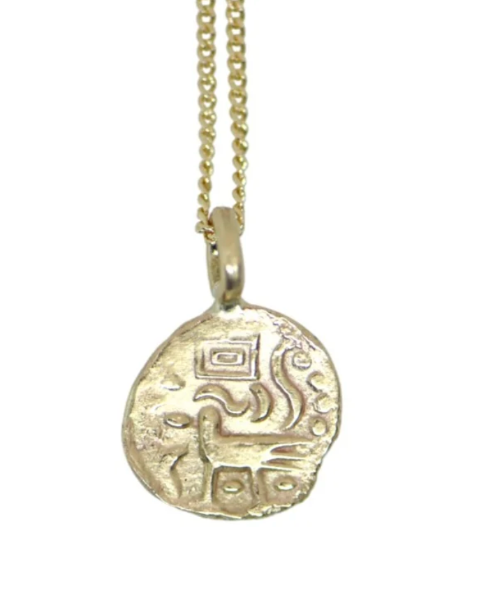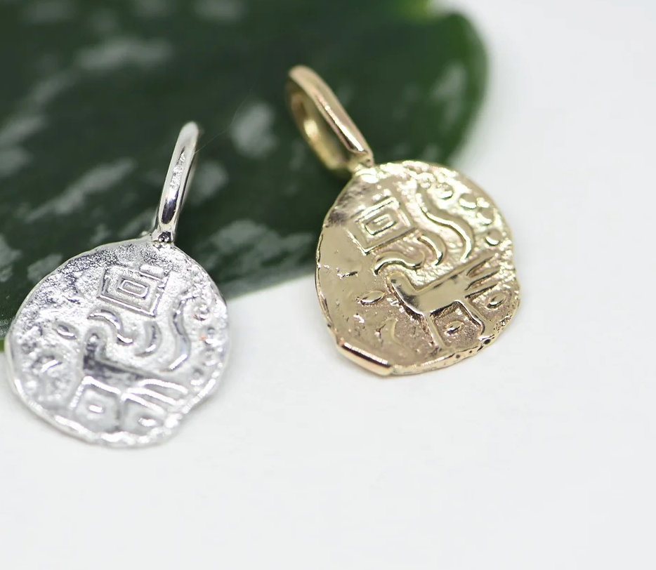 Cast in 14k gold and modeled from a Cambodian tical coin (used 1750-1875) it depicts the mythical Hamsa bird. The Hamsa bird is a metaphor for good luck, enlightenment and the universe. Hamsa can extract good from evil. Its flight represents the cycle of birth, life and death. It is said that when you hold this coin, you hold the whole world in your hand. 🦢