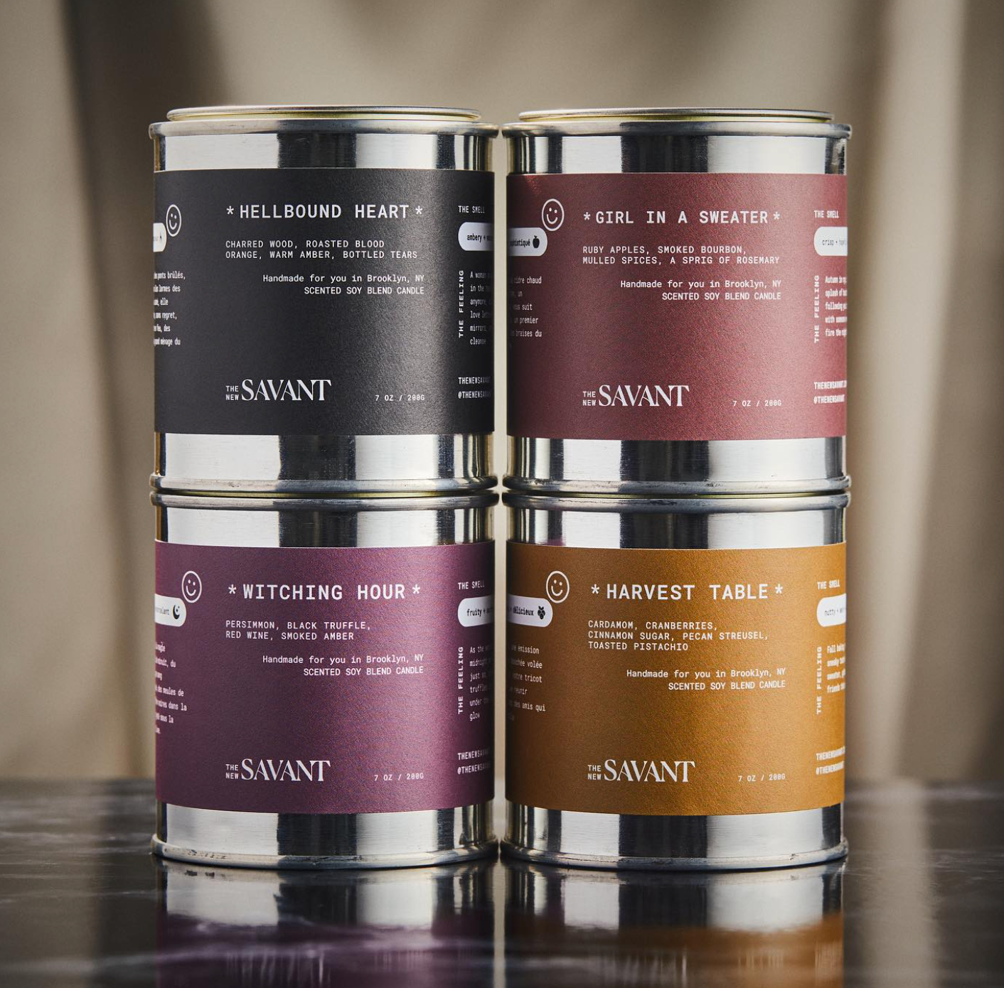 PRODUCT DETAILS • Net Weight: 7oz. / 200g • Burn time: up to 50 hours (7oz) • American made soy wax blend + cotton wicks • Custom fragrance oils made with synthetic + natural materials • Stainless steel vessel made from 25% post consumer waste