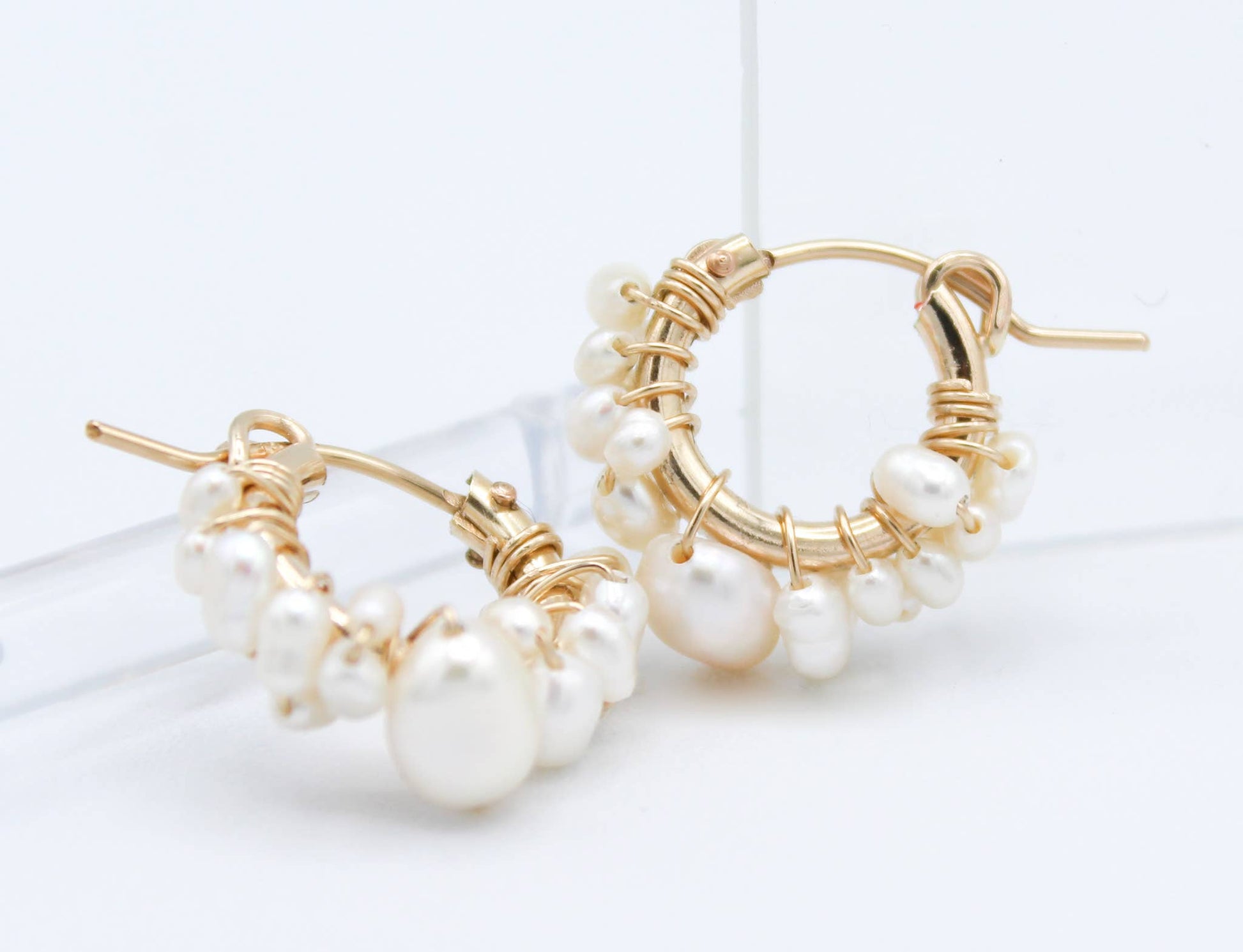 Made with different size baroque freshwater pearls. 14k gold filled hoops and .5" in diameter.