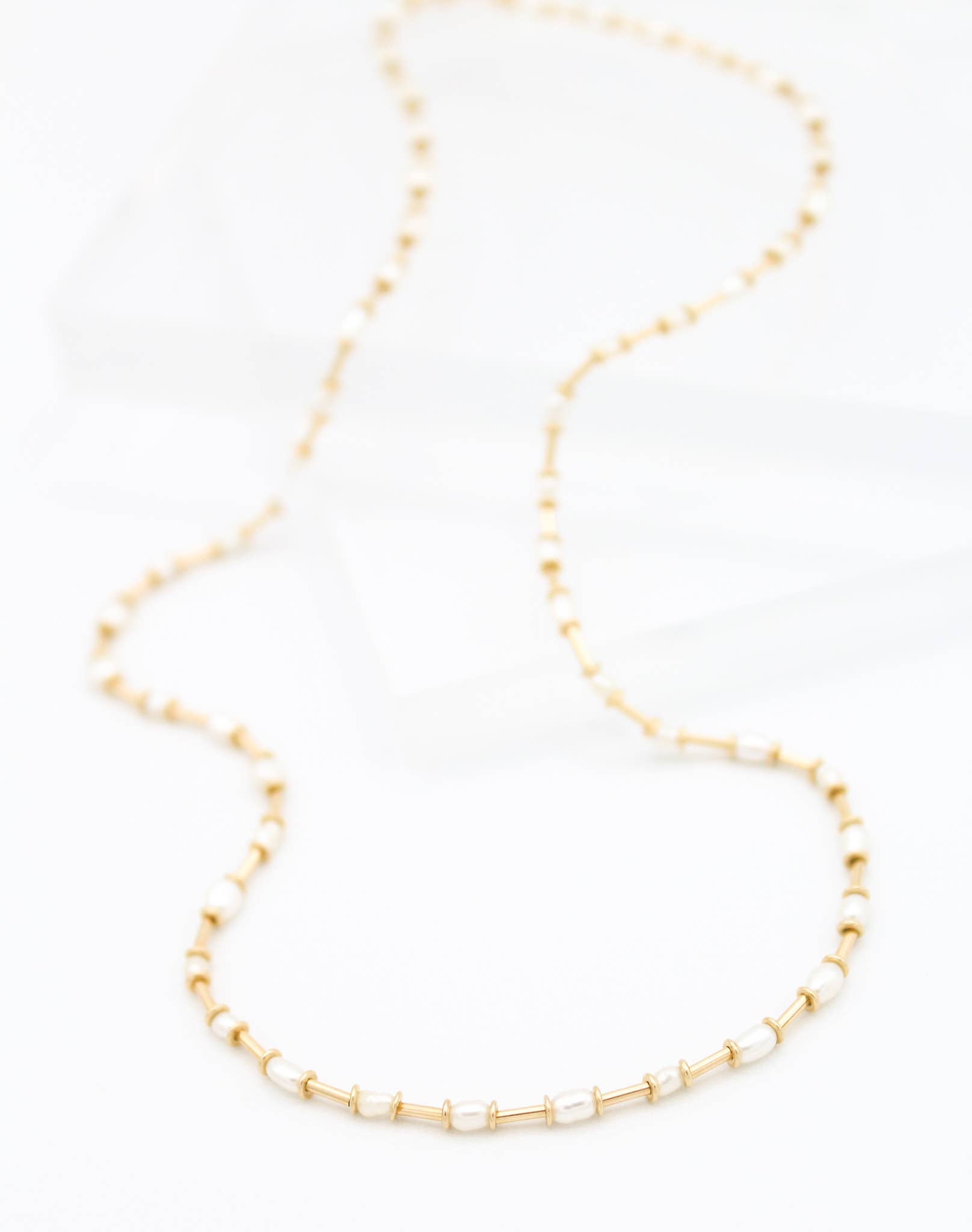 The smooth texture of the 14k gold fill tube beads mixed with the tiny freshwater pearls gives this necklace a stitched feel.