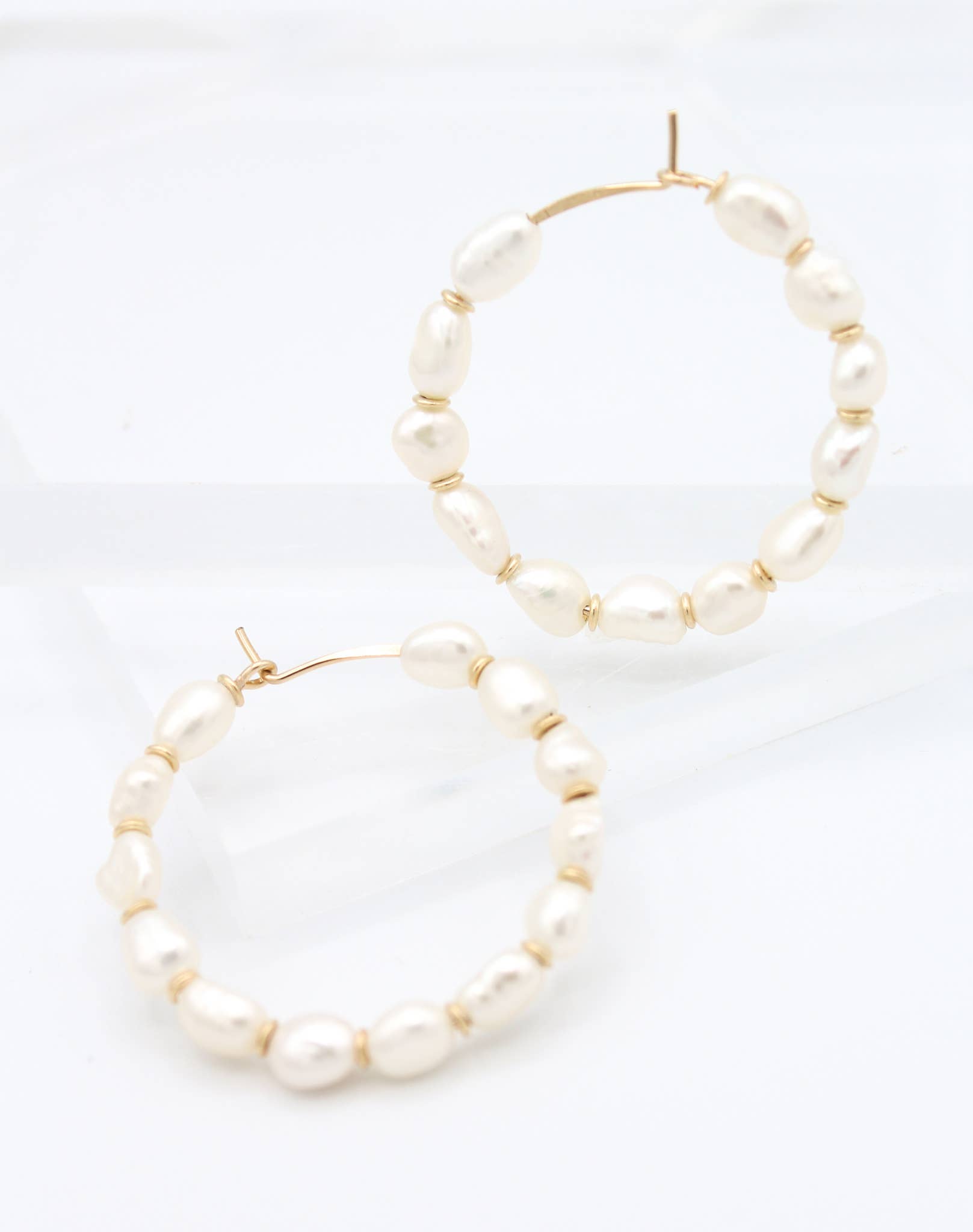 Details: 1.25” diameter 14k gold filled hoop wire Freshwater pearls