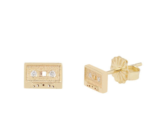 A tiny bit of musical nostalgia to adorn you, or a perfect gift for anyone with music as their love language - these tiny cassette tapes in solid 14k gold feature two flush set diamonds and holographic stippling.