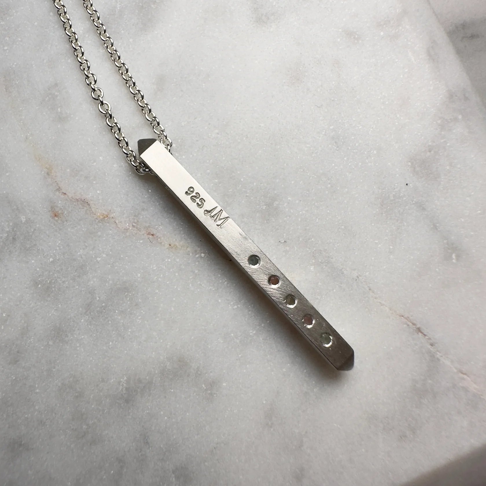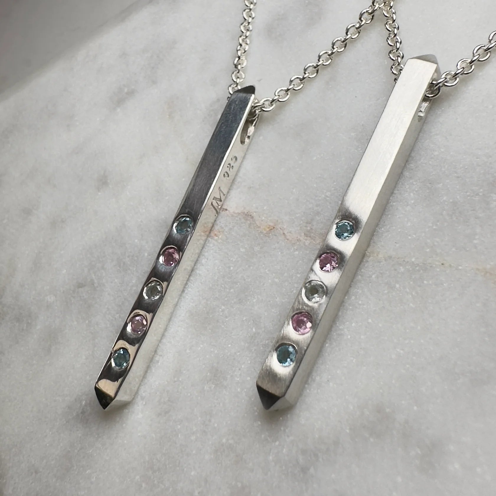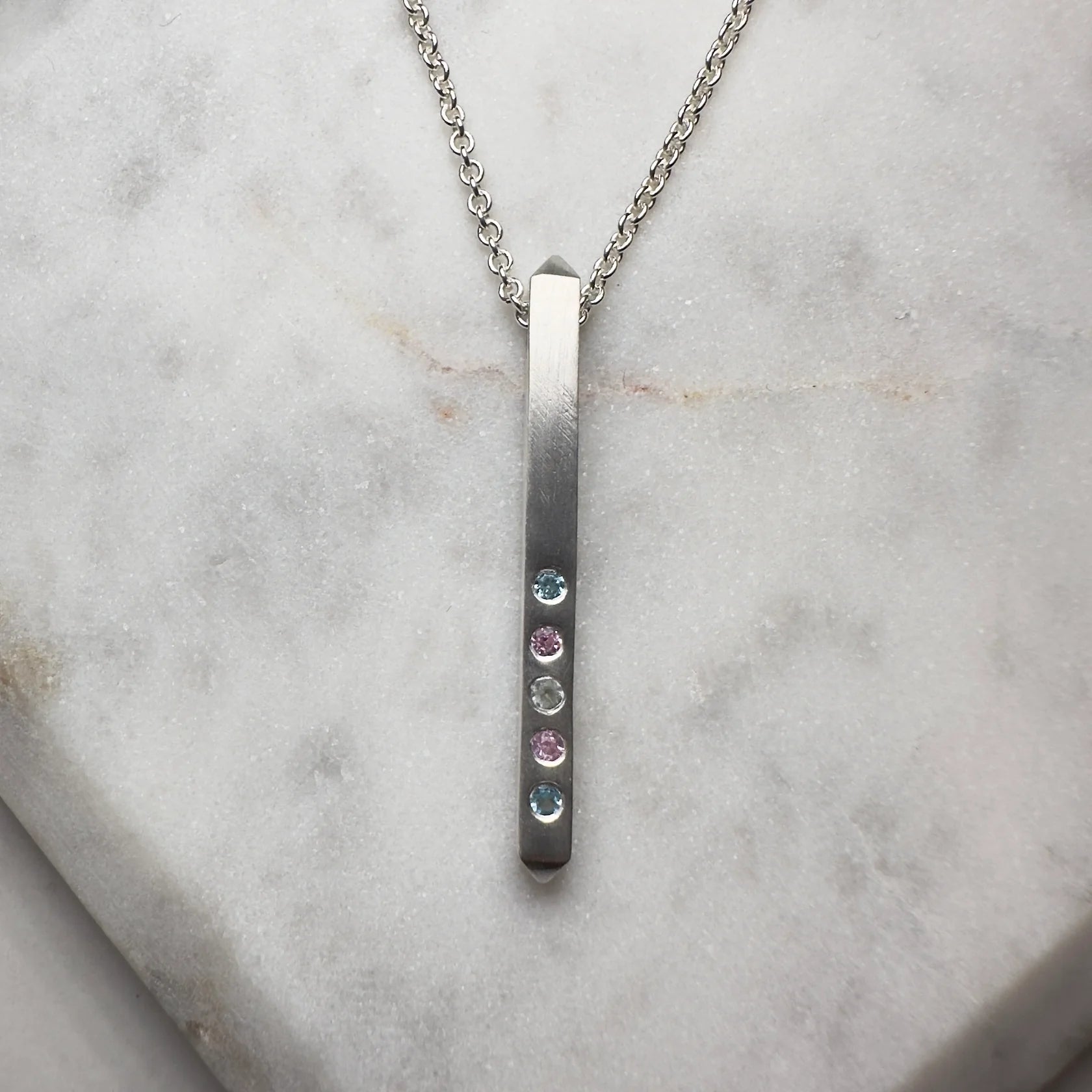 Show your love for the Trans community with this minimalist necklace! This sleek, unisex and versatile pendant features two Swiss Blue Topaz, two Pink Sapphires and one White Topaz, which have all been flush set into a solid sterling silver bar.
