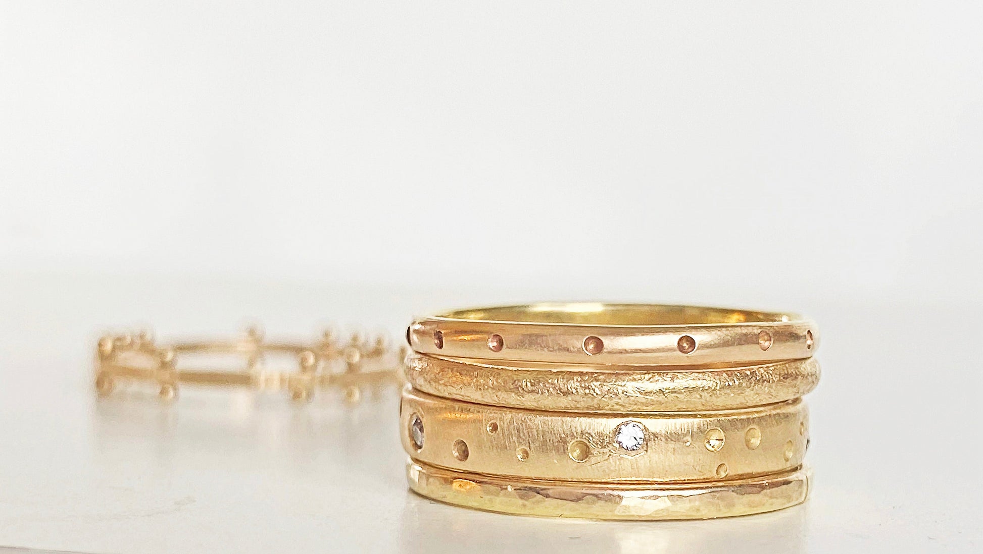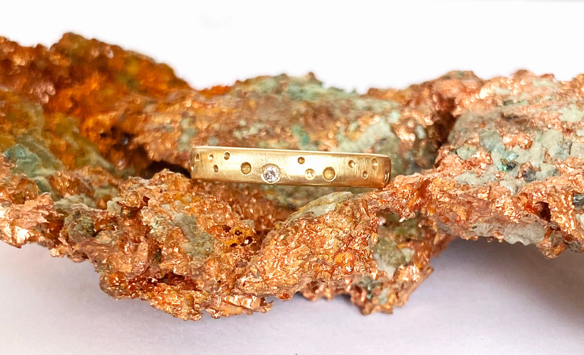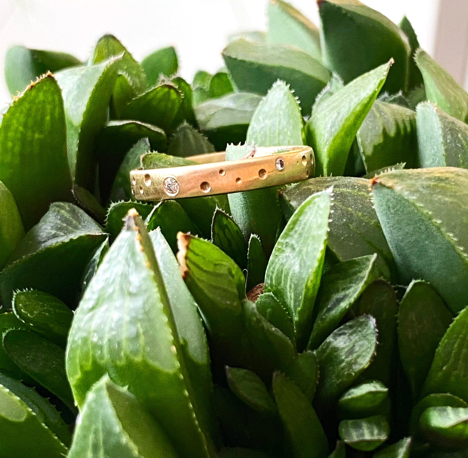 A smooth half round band of 18kt gold, with a scattering of diamonds and dots all the way around it. Each band is unique and will show a slightly different pattern due to the handmade nature.