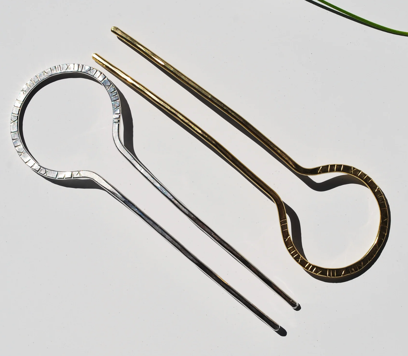Hand forged heavy gauge metal hair pin in either Brass or Sterling Silver. Stamped with XIII (numbeer 13) around the curve.